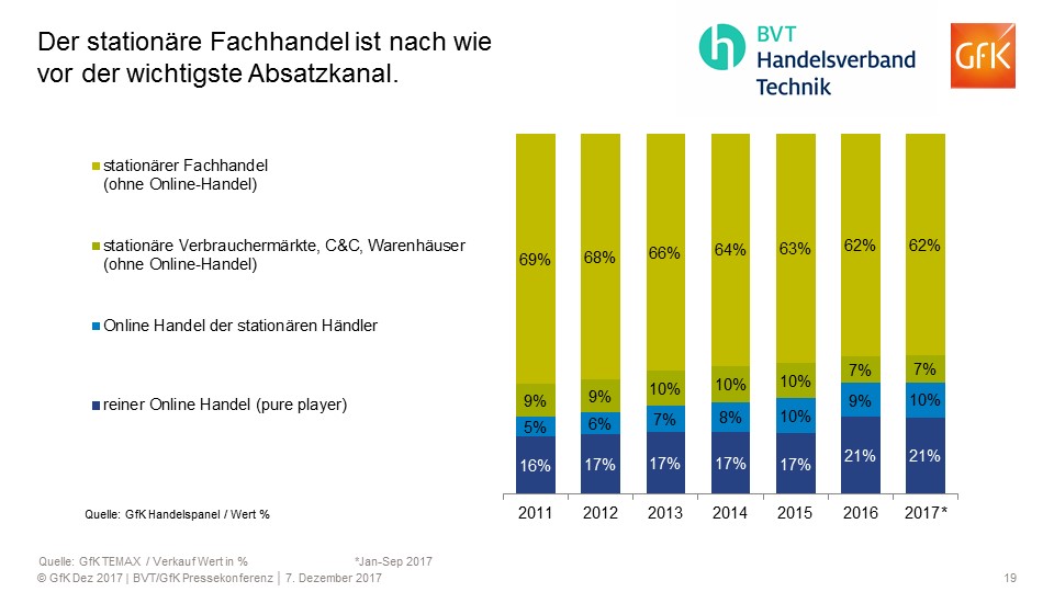 Kein Wunder also, dass die Deutschen ihre Elektrogeräte am liebsten auch weiterhin in stationären Geschäften kaufen. Dort geben sie 69 % ihres Technik-Budgets aus. Als Markttreiber bleibt der Onlinekanal aber wichtig. Fischel: „Fast jeder dritte Technik-Euro wird inzwischen im Internet ausgegeben – in den Onlineshops der stationären Händler und bei reinen Onlinehändlern. Viele stationäre Händler investieren in ihre Multichannelpräsenz und nehmen das Onlinewachstum mit. Ein Drittel des Online-Umsatzes geht inzwischen schon über die Onlineshops der stationären Händler.“