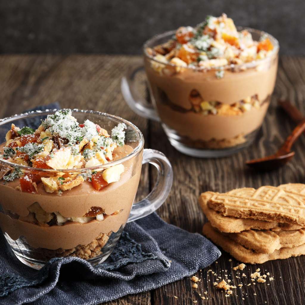 - In der Zwischenzeit die gedörrten Früchte klein schneiden. Danach die Creme, die Früchte, den Spekulatius, und den Kräuterzucker abwechselnd in Gläsern schichten. Als Topping kommen die Dörrfrüchte und der Kräuterzucker zum Schluss dazu.