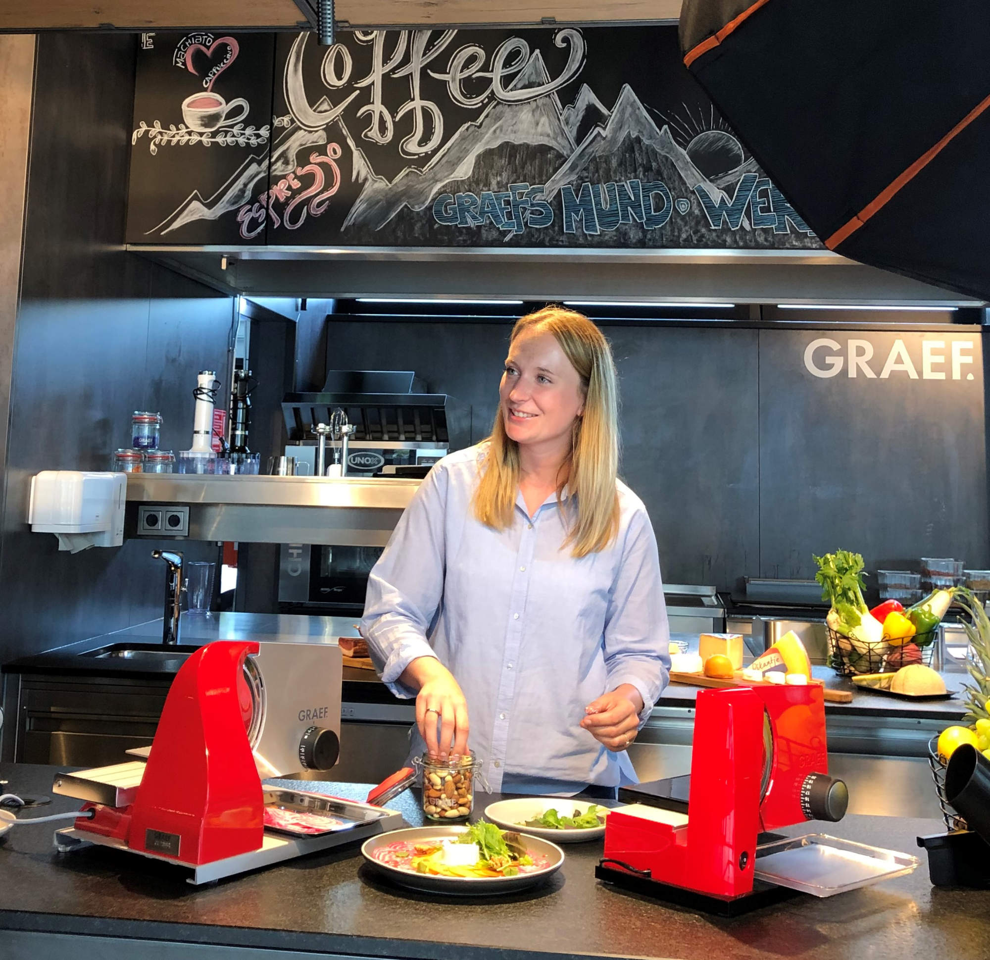 So viel Zeit muss sein: „Erst trinken wir einen kräftigen Espresso aus dem Siebträger“, begrüßt uns Franziska Graef, Head of Marketing des Arnsberger Familienunternehmens Gebrüder Graef, im Bistro Graefs Mundwerk. Stylisches Ambiente hinter historischer Backsteinfassade, regionale wie saisonale Küche mit Frische-Kick, dazu Markenzentrum mit individuell designten Allesschneidern und Siebträgern. Ein Fest für alle Sinne.