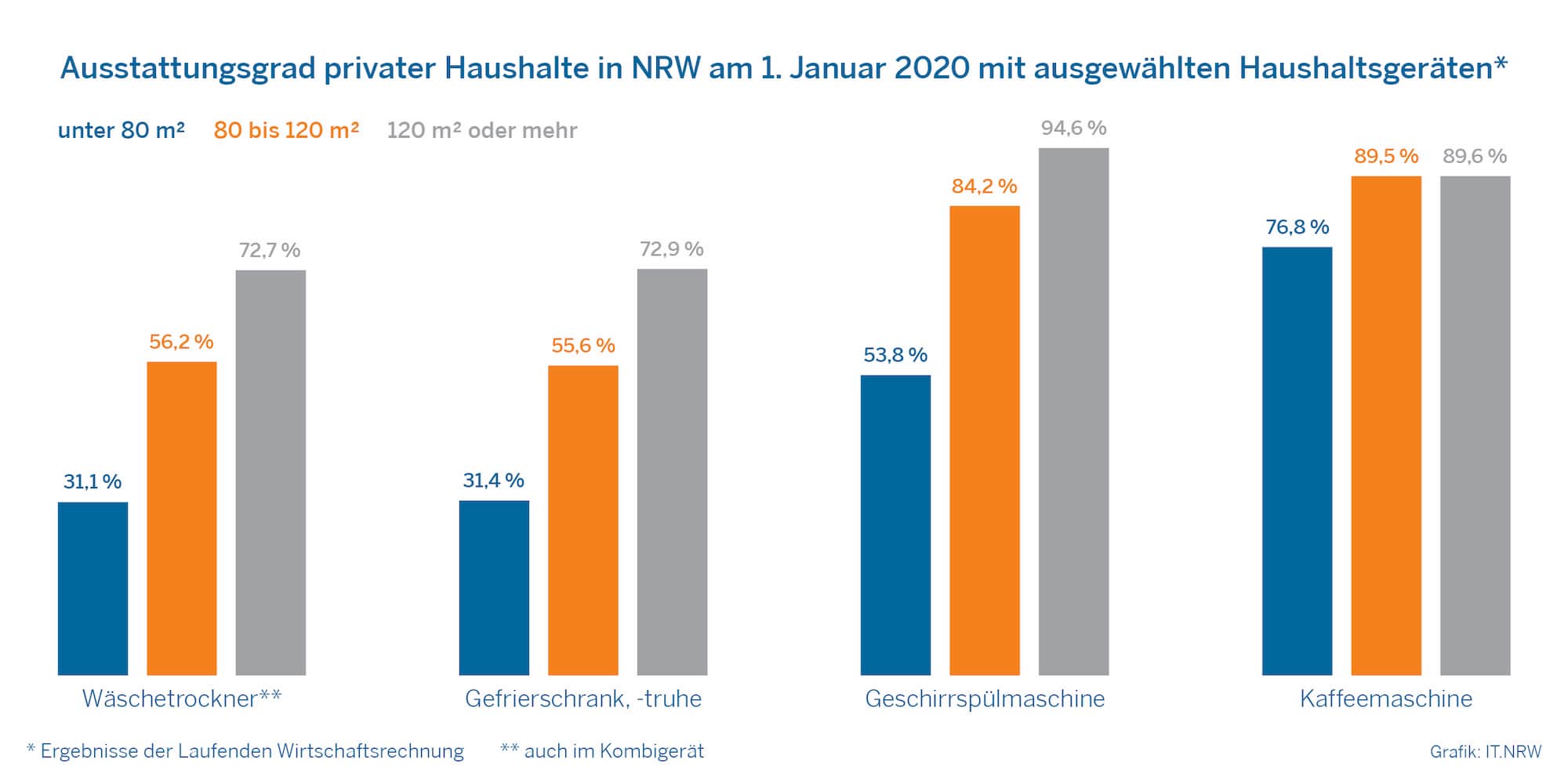 Einen spannenden Einblick in die Haushaltsausstattung mit Elektrohausgeräten in Nordrhein-Westfalen gewährte jetzt das Statistische Landesamt. Die Statistik „Laufende Wirtschaftsrechnungen” ist eine (jährliche) Unterstichprobe der alle fünf Jahre stattfindenden Einkommens- und Verbrauchsstichprobe. Sie liefert neben Informationen zur Ausstattung mit Gebrauchsgütern auch Daten zur Wohnsituation, die sich wiederum in Relation zur Hausgeräteabdeckung setzten lässt.
