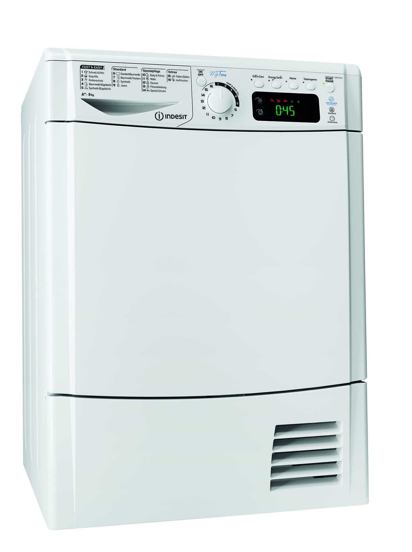 Der Indesit Wärmepumpentrockner EDPE G45 A2 ECO aus der MyTime -Serie bietet optimale Trockenergebnisse und gleichzeitig die maximale Ersparnis. Die „Load Balance“-Technologie passt das gewählte Programm dem Gewicht der Ladung an – ein innovatives Sensorsystem ermittelt das Wäschegewicht und das Gerät reguliert automatisch die Trockenzeit. Das schont Ressourcen: Bei geringerem Gewicht wird entsprechend Zeit und Energie eingespart (z. B. 45 % bei halber Ladung gegenüber einer Ladung von 8 kg). MyTime ist der erste Trockner, der bei jeder Ladung automatisch Zeit- und Energieeinsparungen von bis zu 70 % erzielt. Die große Auswahl an Kurzprogrammen trocknet die Wäsche schnell und erleichtert so das Bügeln im Anschluss.