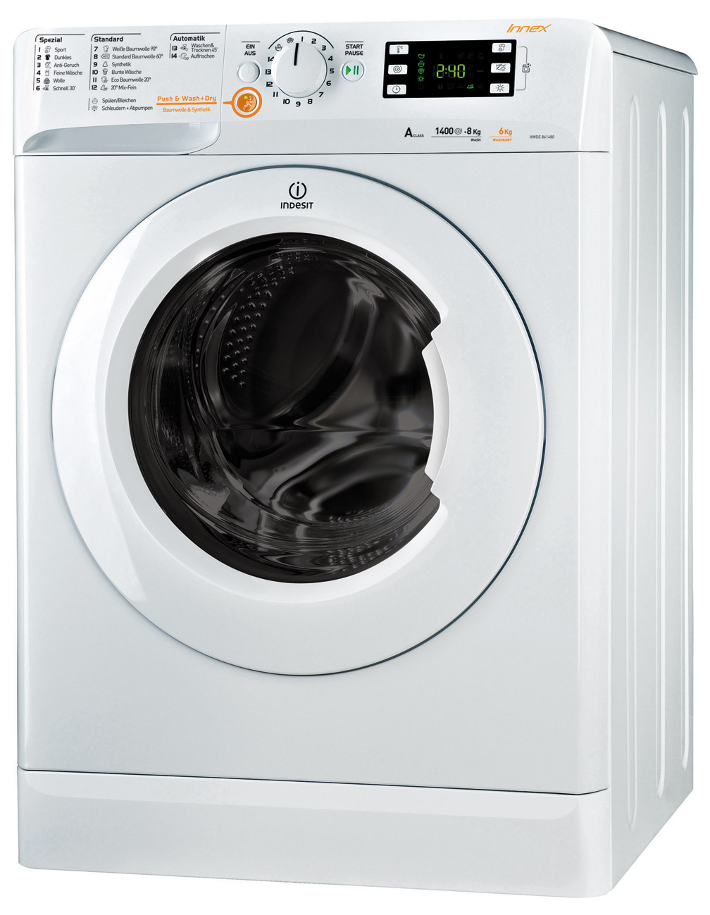 Indesit Waschtrockner Innex XWDE 861480X W DE wäscht und trocknet Kleidungsstücke aus Baumwolle und synthetischen Materialien zusammen. Push & Wash + Dry wäscht bei 30 Grad. Es benötigt gegenüber einem normalen Synthetik-Programm 30 Prozent weniger Zeit und verbraucht 15 Prozent weniger Energie, so der Hersteller.