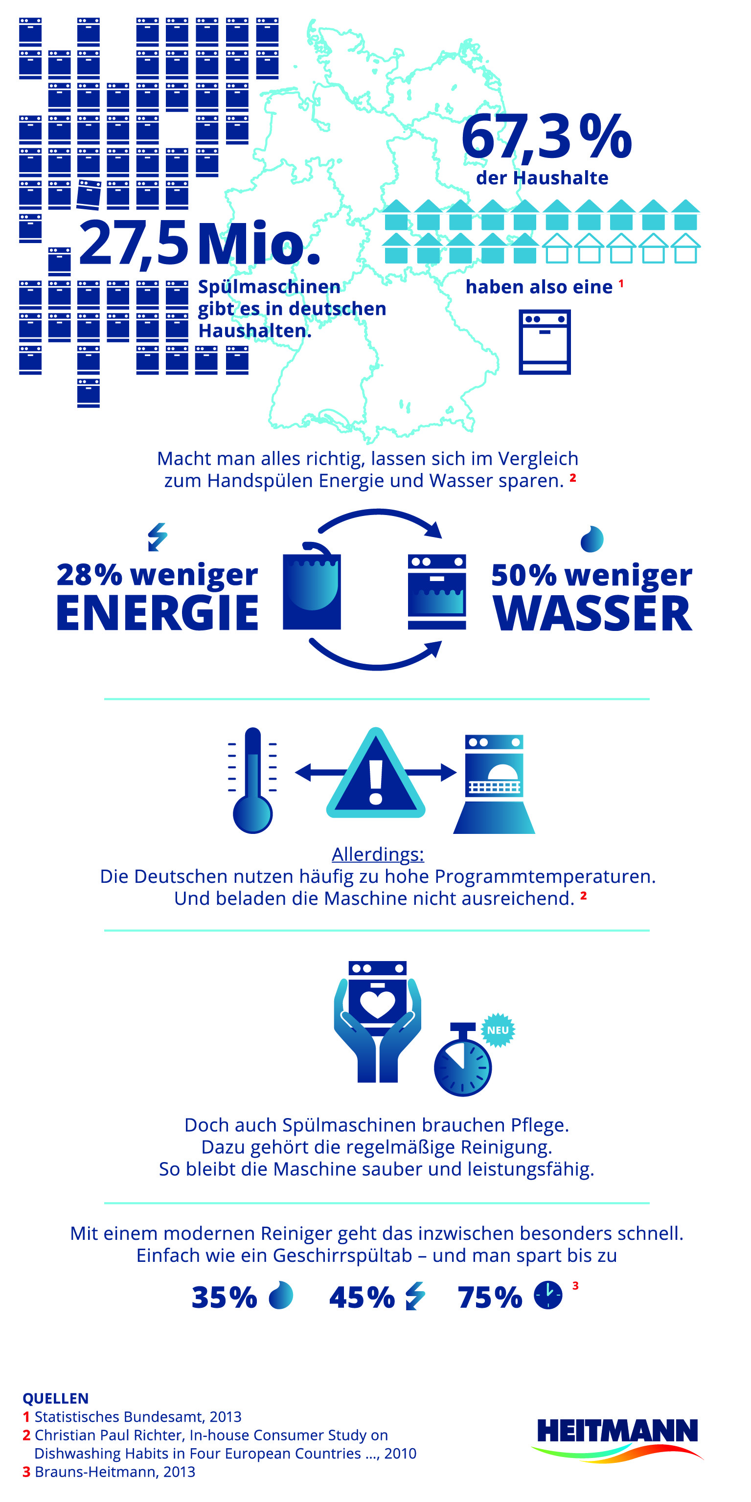 Mit einem modernen Spülmaschinenreiniger lassen sich bis zu 35 Prozent Wasser, 45 Prozent Strom und 75 Prozent Zeit sparen. Produkte, wie der “Express-Spülmaschinen-Reiniger” von HEITMANN, sind in der Anwendung so einfach wie ein Geschirrspültab. Kalk, Fett und unangenehme Gerüche verschwinden erstmals bereits im Kurzprogramm. Regelmäßig angewendet bleibt die Spülmaschine sauber und leistungsfähig.