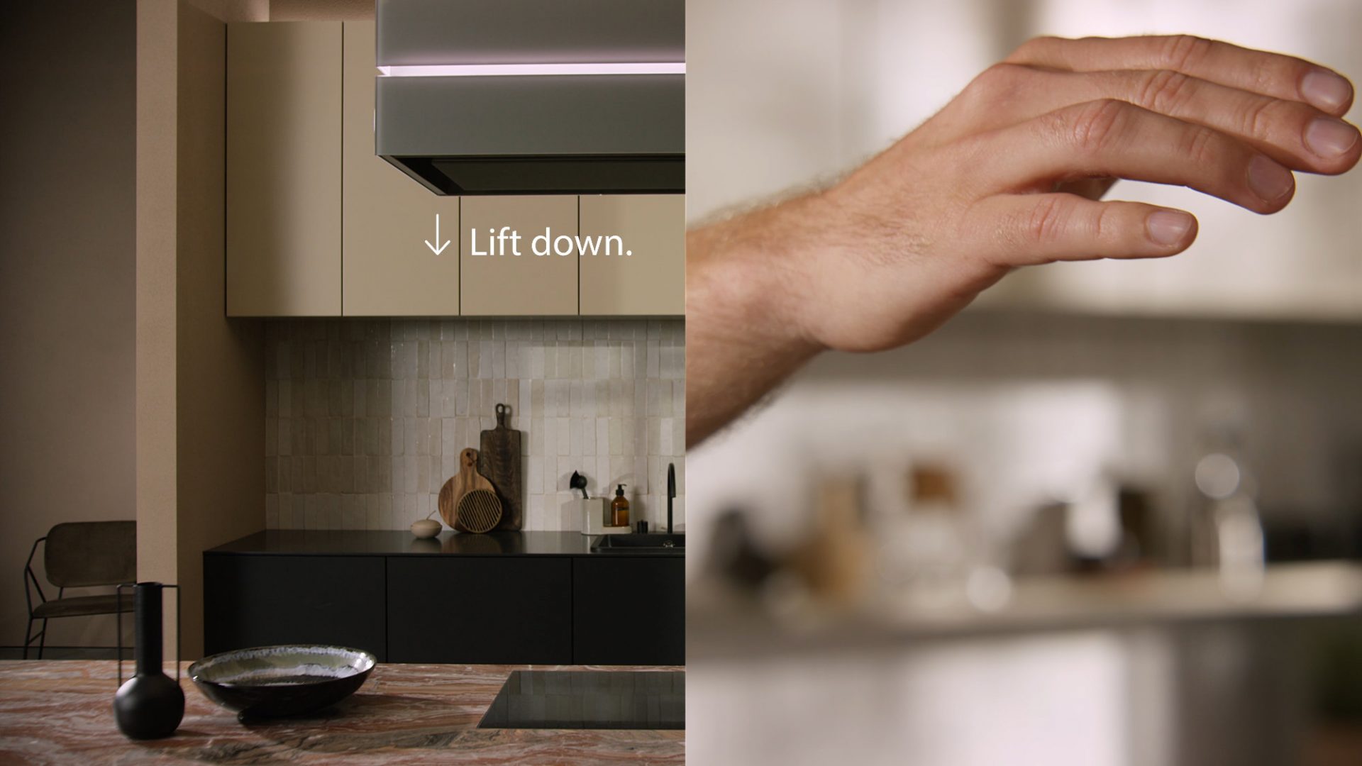 Die innovative Gestensteuerung ermöglicht es, die Grundeinstellungen von Lift, Licht und Lüfter der Inselhaube bequem per Handbewegung vorzunehmen, so dass das Hantieren mit verschmutzten Fingern an der Haube der Vergangenheit angehört.