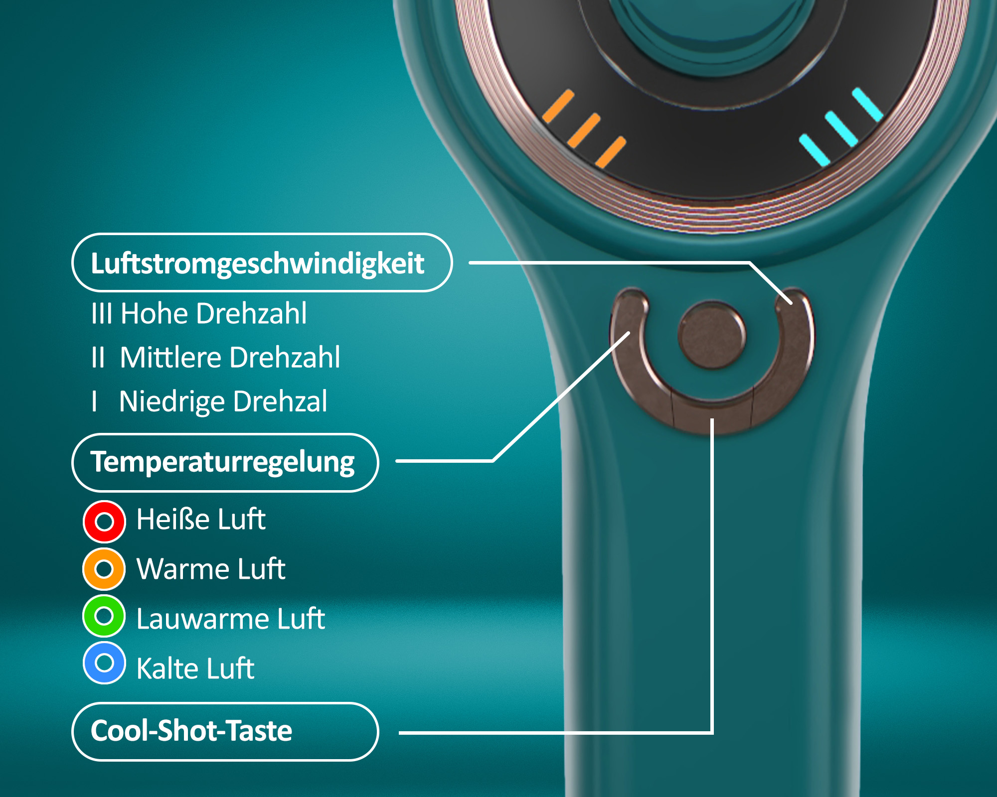 - 3 Geschwindigkeits- und 4 Temperatureinstellungen