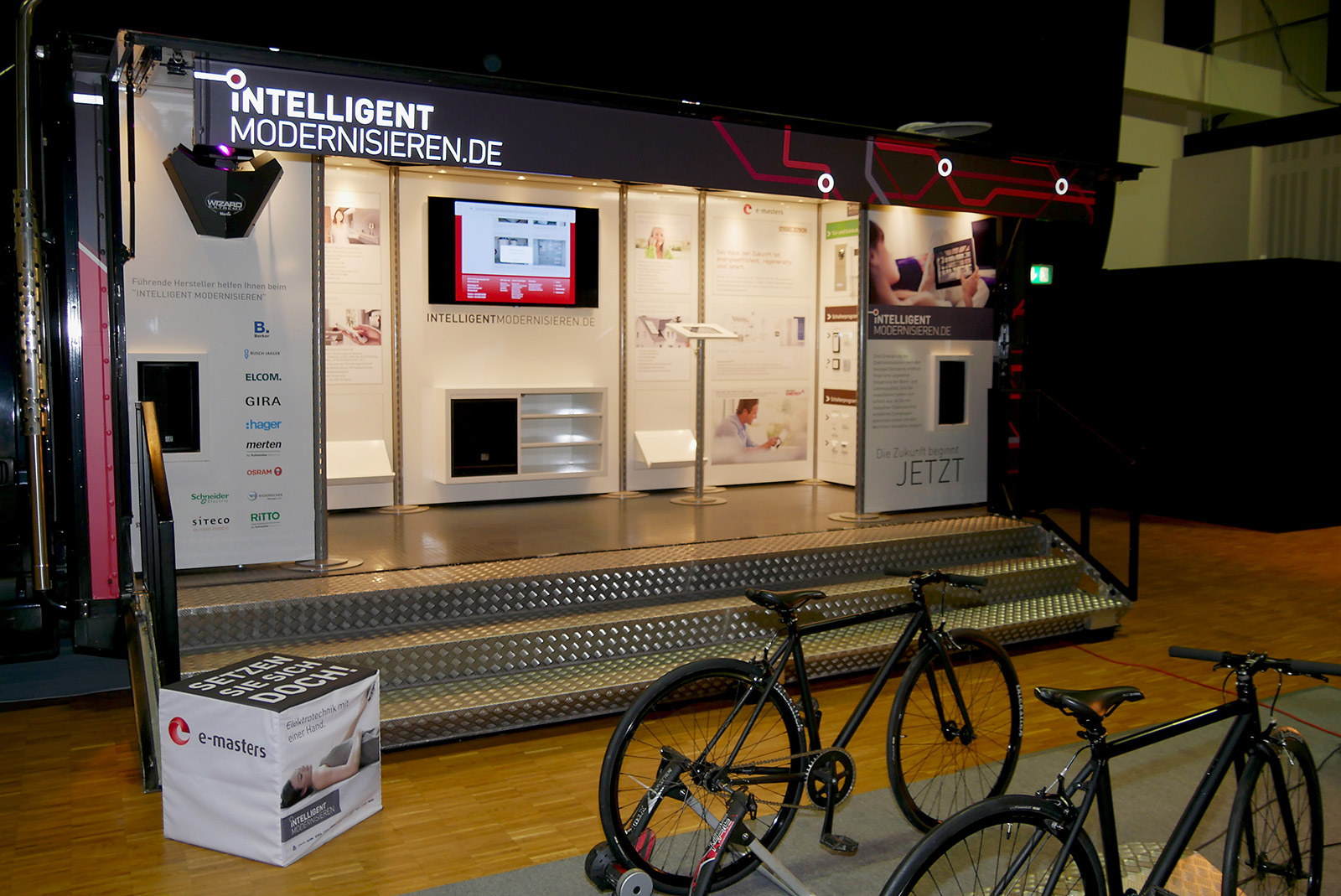 Das Thema „Intelligent Modernisieren“ steht auch weiterhin ganz oben auf der e-masters Agenda. So wird es wohl im Herbst eine Fortsetzung der TV-Werbung geben. Ferner sind zusätzlich bundesweit vier mobile Präsentationsfahrzeuge unterwegs, um beim Häuslebauer bzw. bei der Haussanierung für die neuesten Möglichkeiten bei der Elektroinstallation und beim Thema Smart Home zu werben, ganz nach der Devise: Moderne Elektroinstallation zum Anfassen und Ausprobieren, Showeffekte inklusive. Nicht zu übersehen war auch das große neue TechnikMobil, das sich derzeit noch in der Konstruktionsphase befindet, aber auf dem „trendform“ schon im „Rohbau“ zu besichtigen war.