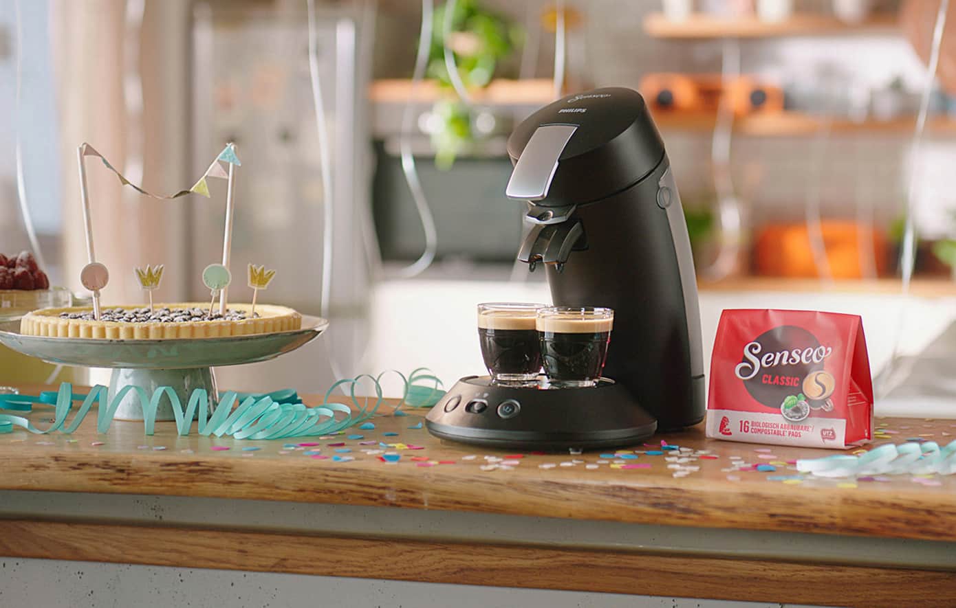 Das Geburtstagsmodell verbraucht 45% weniger Strom als das Vorgängermodel. Gleichzeitig ist der Senseo-Kaffee nachhaltig angebaut.