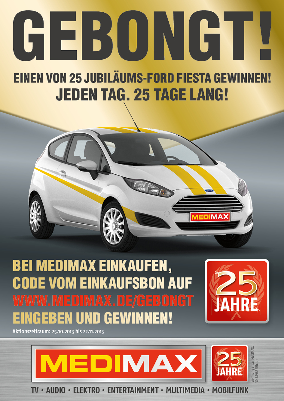 Zum 25. Geburtstag gibt MEDIMAX noch einmal richtig Gas: Die Fachmarktlinie der Verbundgruppe ElectronicPartner verlost 25 Ford Fiestas an 25 Tagen.