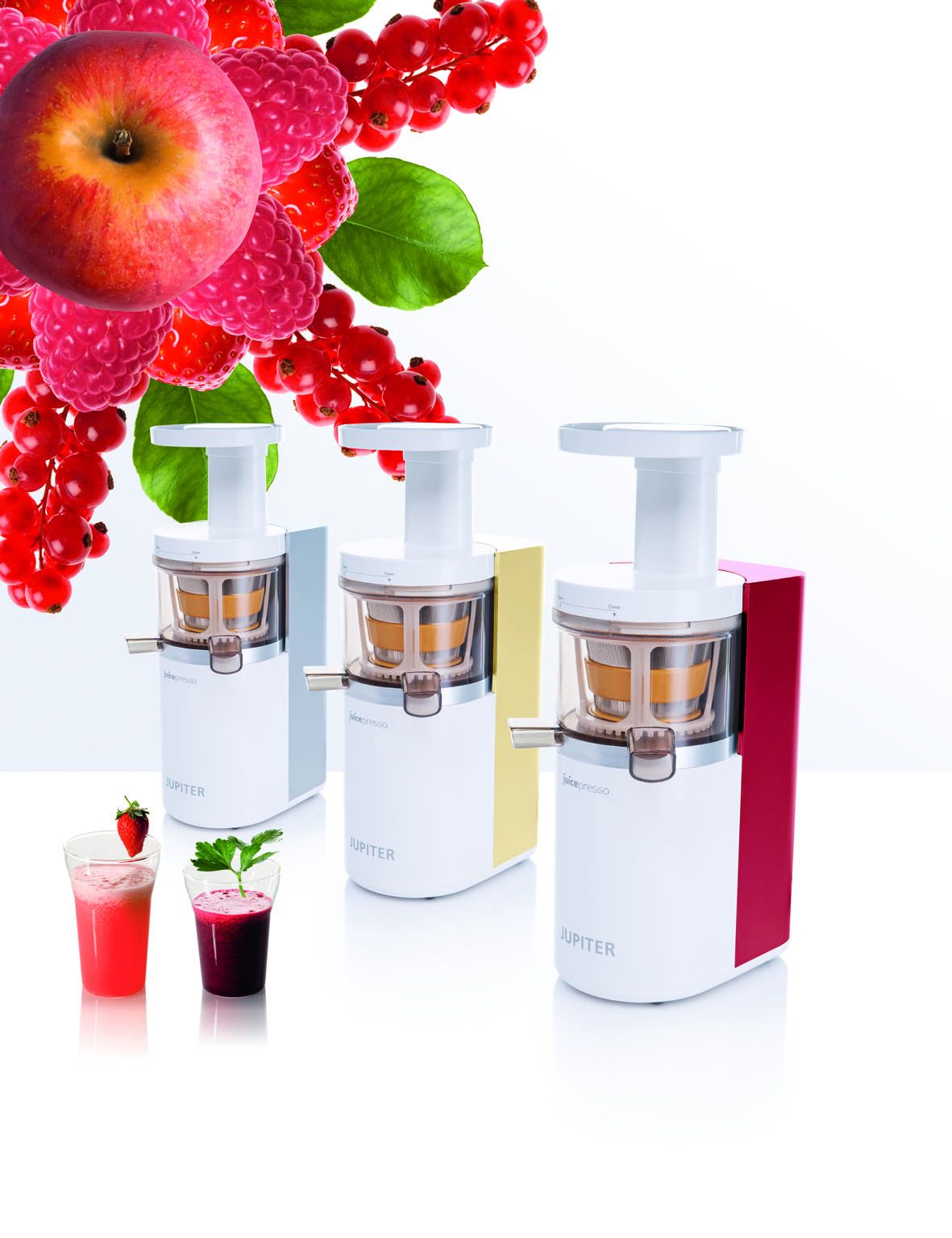 Den Jupiter Juicepresso Entsafter gibt es ab sofort in drei tollen Farben. Dank innovativer Technik hat der Jupiter Juicepresso Entsafter einen wahren Siegeszug angetreten. Während man zur Produkteinführung auf die eher schlichte Grau-Weiß-Optik gesetzt hatte, kann jetzt auch unter frischem Rot-Weiß oder zartem Beige-Weiß gewählt werden. Der Jupiter Juicepresso Entsafter punktet mit einem neuen, schonenden Extraktionsverfahren. Superschnell, superleise und supersanft verarbeitet er selbst harte Früchte, Gemüse und Blattgemüse zu frischen, gesunden Säften. Möglich macht’s die mit niedriger Geschwindigkeit arbeitende Schraub-Presstechnik (ca. 40 UpM). So wird keine Wärme frei und die Zellstruktur des Pressgutes wird nicht zerstört. Vitamine, Mineralien und Enzyme bleiben erhalten. Der Saft ist länger haltbar und überzeugt durch gleichmäßige Konsistenz. Kein Schaum trübt den Saftgenuss. Ein automatisches Auswurfsystem trennt Schalen, Kerne und Stiele vom Fruchtfleisch und sorgt dafür, dass keine Blockaden auftreten. Und selbst die Reinigung des Geräts dauert nicht länger als drei Minuten. Einfach mit fließendem Wasser durchspülen und weiter geht’s.
