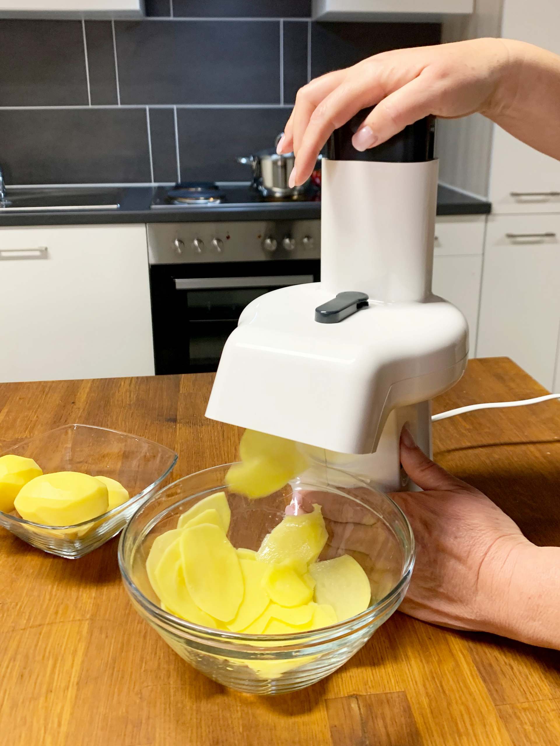 Die Scheibenraffel kann raffeln, raspeln, reiben und schneiden – ob Kartoffeln, Käse, Nüsse, Gemüse oder Obst. Ideal für Rohkostsalate und Bowls, zur Kochvorbereitung von Wurzel- und Blattgemüse, für Kartoffelklöße, Reibekuchen und als nützlicher Begleiter beim Backen.