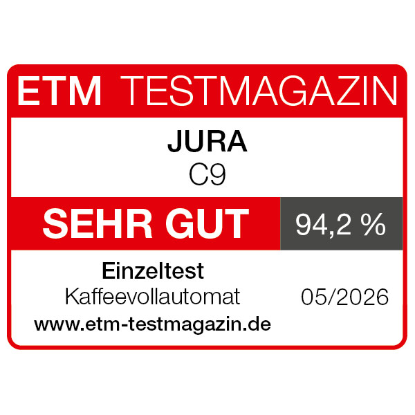 Die JURA C9 wurde im Einzeltest des ETM Testmagazins (Ausgabe 05/2026) mit 94,2 Prozent bewertet und erhielt damit die Gesamtnote „sehr gut“. Der Kaffeevollautomat positioniert sich in der Premium-Economy-Klasse und kombiniert kompakte Bauweise mit Funktionsvielfalt und Bedienkomfort.