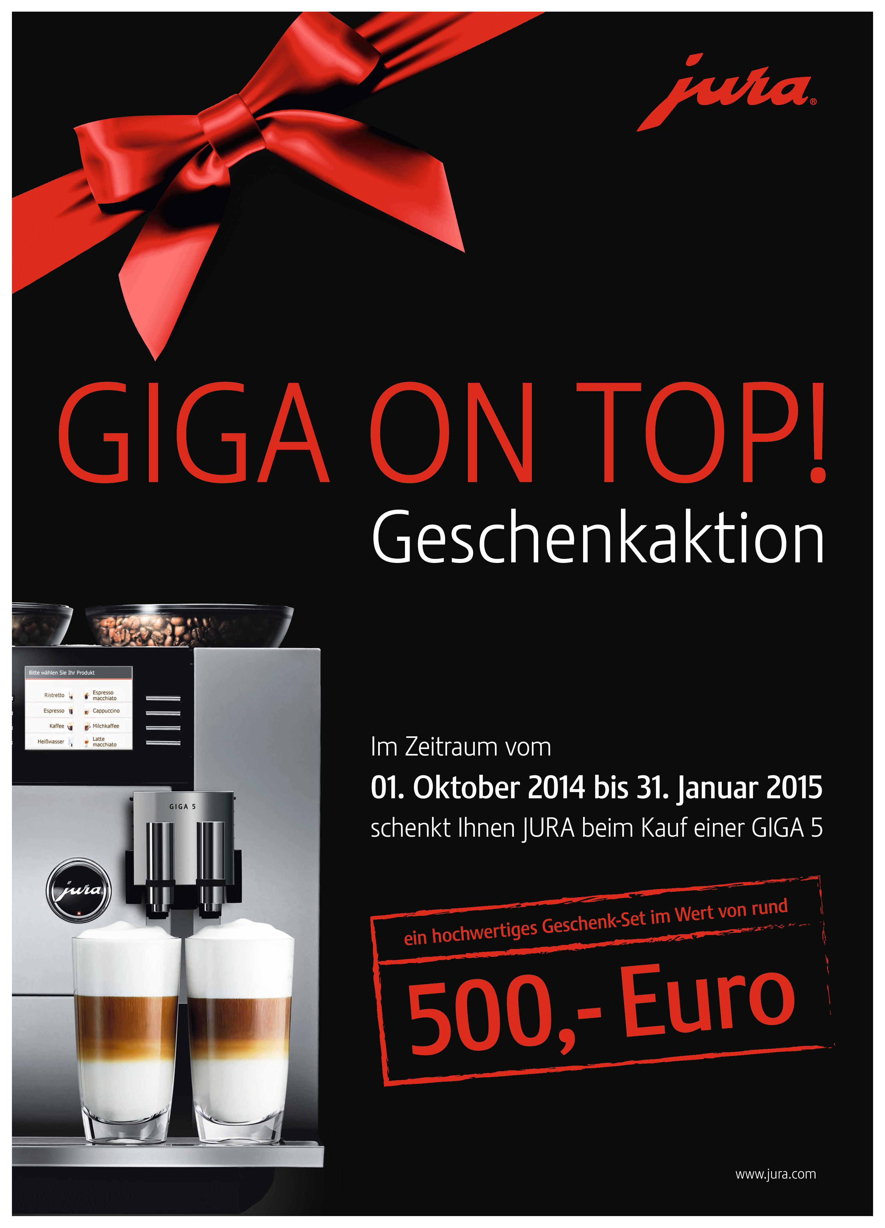 Im Rahmen der Geschenkaktion „GIGA ON TOP!“ erhalten Kaffeliebhaber beim Kauf des High-End-Vollautomaten von Jura ein exklusives Geschenk-Set im Wert von rund 500 EUR. Mit der attraktiven POS-Offerte will Jura im Aktionszeitraum bis zum 31. Januar 2015 seinen autorisierten Fachhandel beim Verkauf unterstützen. Das Geschenkset umfasst neben sechs Spitzenkaffees von Jura ein umfangreiches Zubehör- und Pflegeset: Für stilvollen Kaffee-Genuss ist der Tassenwärmer von Jura im Set enthalten, ein 2er-Set Latte-Macchiato-Gläser sowie ein 2er-Set Kaffeetassen. Für Pflege auf Knopfdruck und ein langfristiges Genusserlebnis sorgen das 3er-Set Filterpatronen, eine 250 ml Flasche Milchsystem-Reiniger sowie eine Packung 2-Phasen-Reinigungstabletten.