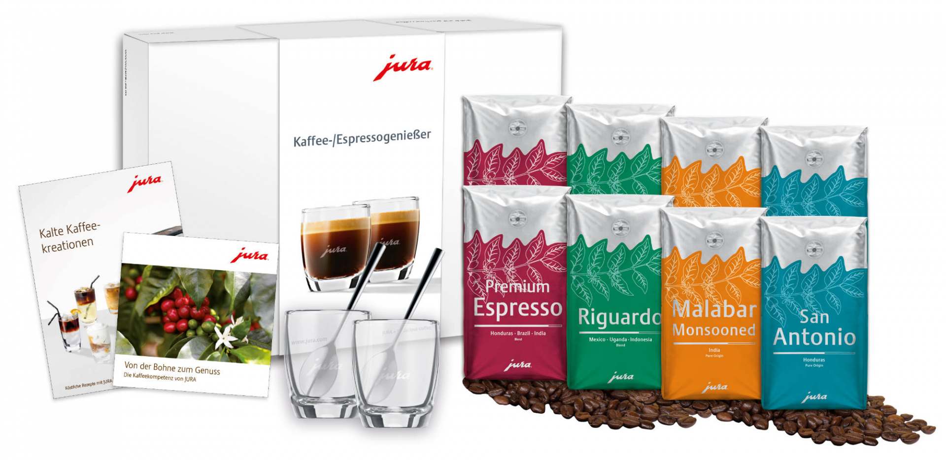 Wer sich bis zum 31. Dezember zum Kauf eines Jura-Kaffeevollautomaten aus der S-Linie, der J-Linie, der Z-Linie oder der Giga-Linie entschließt, kann sich über ein besonders geschmackvolles „Dankeschön“ freuen: Zusätzlich zum neuen Vollautomaten gibt es ein Kaffeegenuss-Paket. Darin enthalten sind je 2 x 250 Gramm Jura Premium Espresso, 2 x 250 Gramm Jura Riguardo, (im „Milchschaumgenießer-Paket“ 2 x 250 Gramm Café Crème), 2 x 250 Gramm Jura San Antonio sowie 2 x 250 Gramm Jura Malabar Monsooned. Alle zusammen reichen für rund 250 Tassen edlen Spitzenkaffees.
