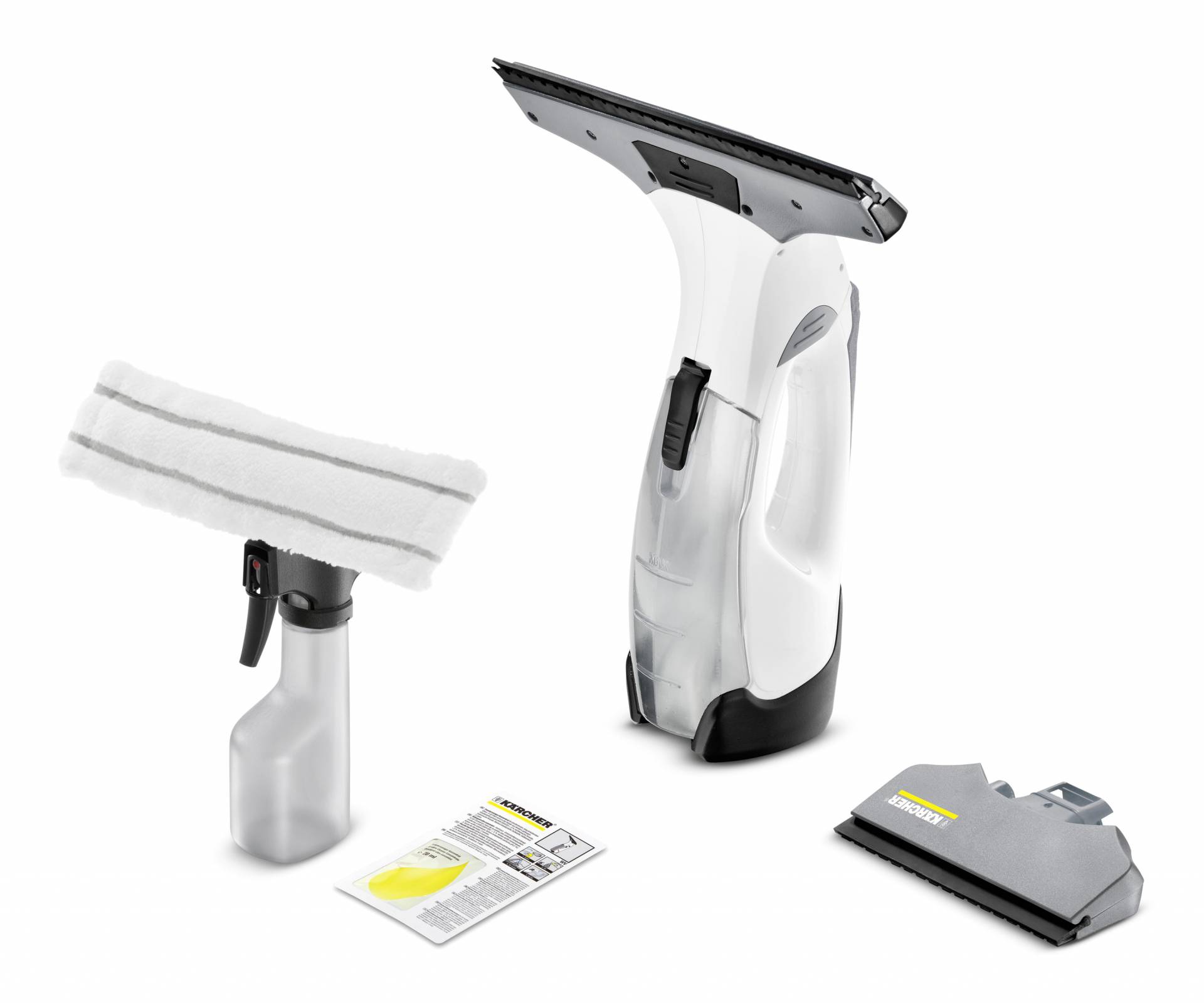 Zum Lieferumfang des Kärcher Fenstersauger WV 5 Premium gehören die Sprühflasche mit Mikrofaser-Wischbezug, Reinigungsmittel-Konzentrat und eine schmale Saugdüse, beispielsweise für Sprossenfenster. Das optionale Verlängerungsset enthält zwei Teleskopstangen und ein Mikrofasertuch. Außerdem sind ein zusätzlicher Akku und ein Set aus Ladestation mit Ersatzakku für den Fenstersauger im Angebot.