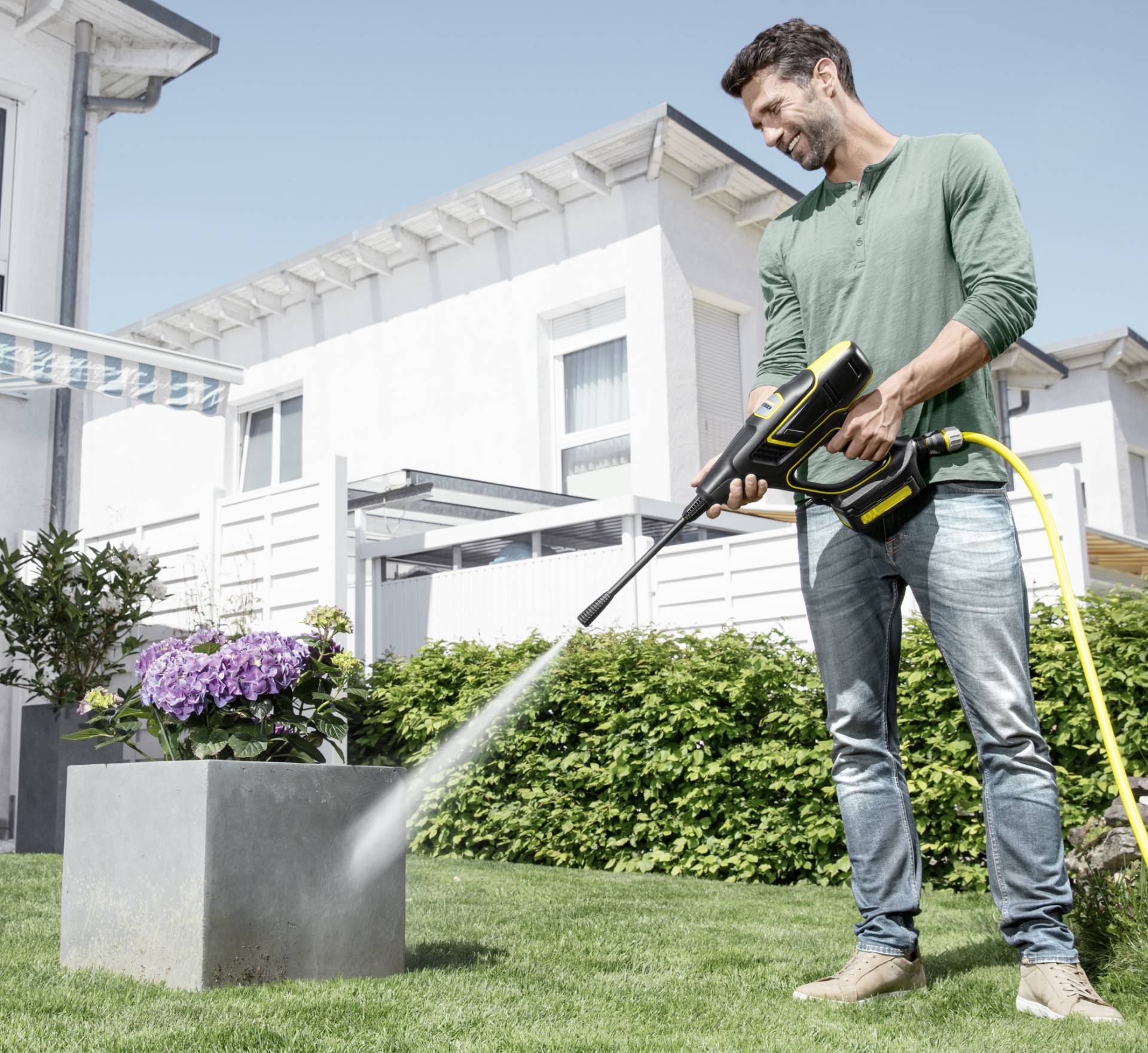 Der Kärcher Hochdruckreiniger KHB 5 Battery ist ohne viel Vorbereitung startbereit, da der Schlauch für die Wasserzufuhr mit nur einem Handgriff direkt an der Pistole angeschlossen wird. Ein einfacher Knopfdruck ermöglicht Einsetzen und Entnehmen des austauschbaren Akkus.