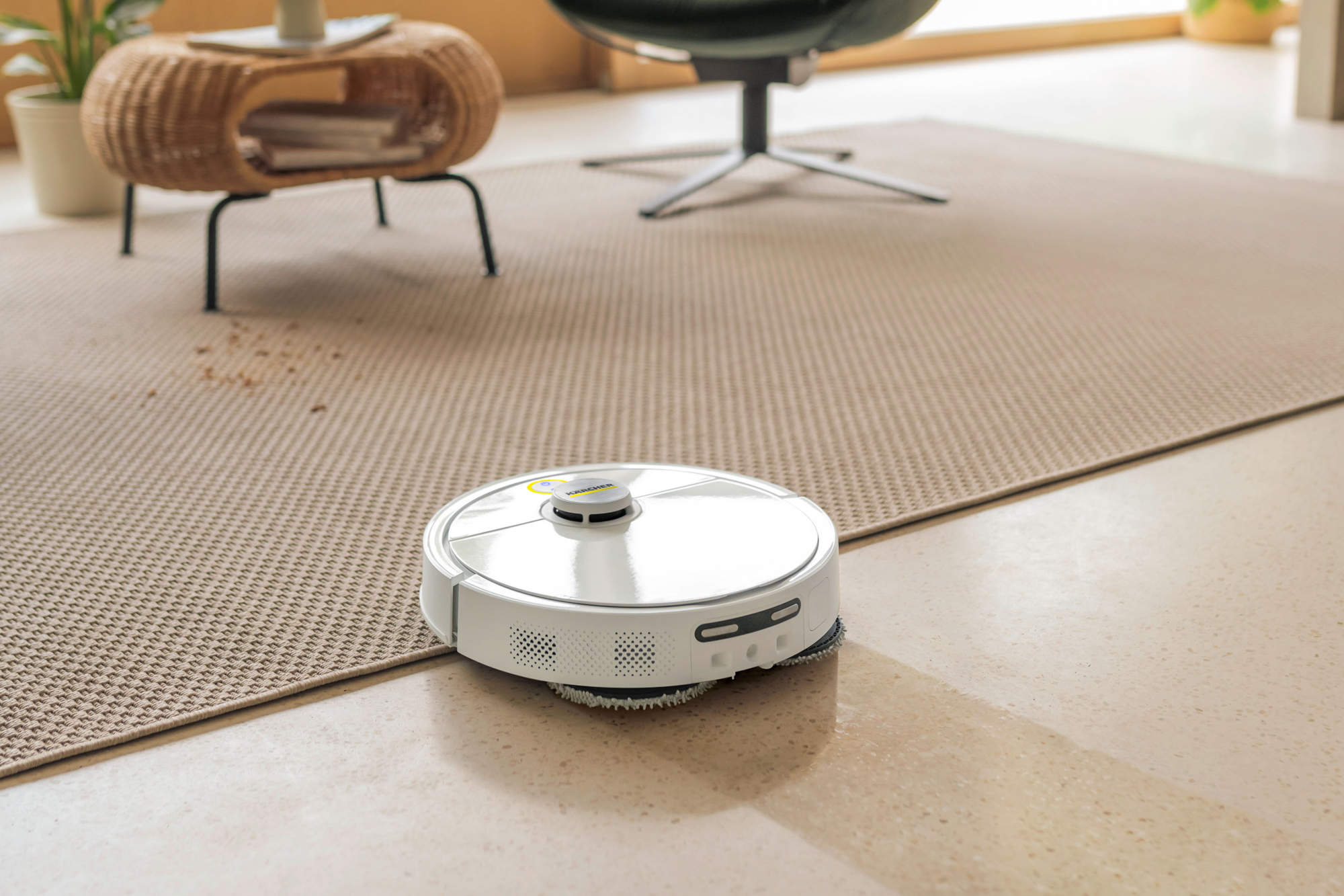Als erstes Modell der Kärcher Saugwischroboter verfügt er über zwei rotierende und anhebbare Mikrofaserpads sowie ein ausfahrbares Pad für eine besonders randnahe Nassreinigung und hohe Flächenabdeckung. Für schwer erreichbare Ecken und Kanten kann die Wischeinheit ausgefahren werden, während die anhebbaren Pads flexibel auf unterschiedliche Bodenbeläge wie Teppiche reagieren. Im Trockenmodus unterstützen Haupt- und Seitenbürste die Schmutzaufnahme.