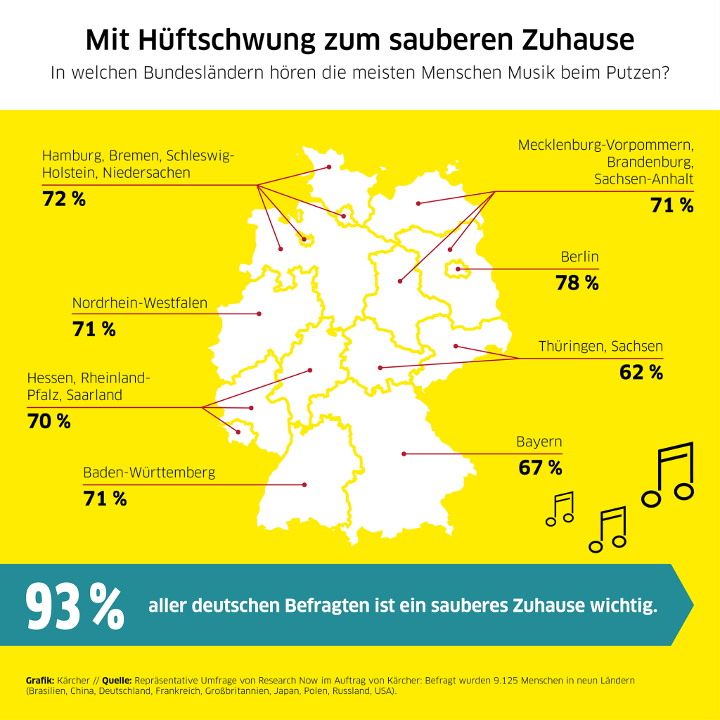 Ein genauer Blick auf Deutschland zeigt, dass vor allem bei den 18- bis 34-Jährigen die musikalische Untermalung während des Putzens hoch im Kurs steht – bei über 80 % spielt Musik eine Rolle. Im Ortsvergleich ist die Hauptstadt deutscher Spitzenreiter: 78 % der befragten Berliner putzen im Takt der Musik. Mit 62 % ist diese Art der Ablenkung in Thüringen und Sachsen nicht ganz so stark verbreitet. Knapp ein Viertel hingegen verzichtet gänzlich auf Nebenbeschäftigungen und konzentriert sich ausschließlich auf die zu bewältigenden Aufgaben im Haushalt.