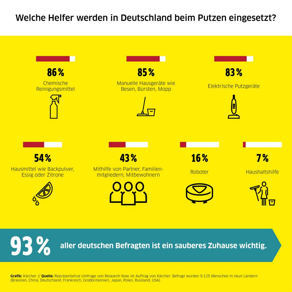 Getreu dem Motto „das Angenehme mit dem Nützlichen verbinden“ versüßt sich die Mehrheit der Deutschen (70 % der Befragten) die Hausarbeit mit der passenden Hintergrundmusik. Insgesamt putzen die Deutschen pro Woche 2 Stunden und 17 Minuten – damit liegen sie sieben Minuten über dem weltweiten Durchschnitt. Nach dem Putzergebnis gefragt, sagt hierzulande einer von fünf Befragten, dass sein Boden sauber genug wäre, um davon zu essen. Das ergab eine Studie, die Research Now im Auftrag von Kärcher weltweit durchgeführt hat. Befragt wurden Teilnehmer in Brasilien, China, Deutschland, Frankreich, Großbritannien, Japan, Polen, Russland und den USA.