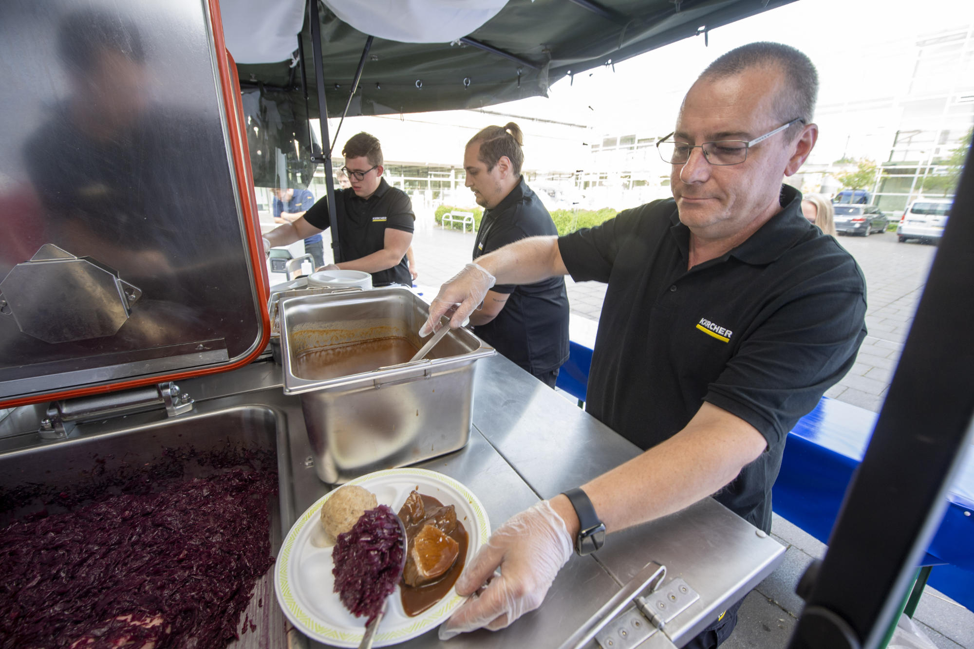 Kärcher-Küchenchef Marcus Henrich versorgt die Helfer mit ausgewogenen Mahlzeiten.