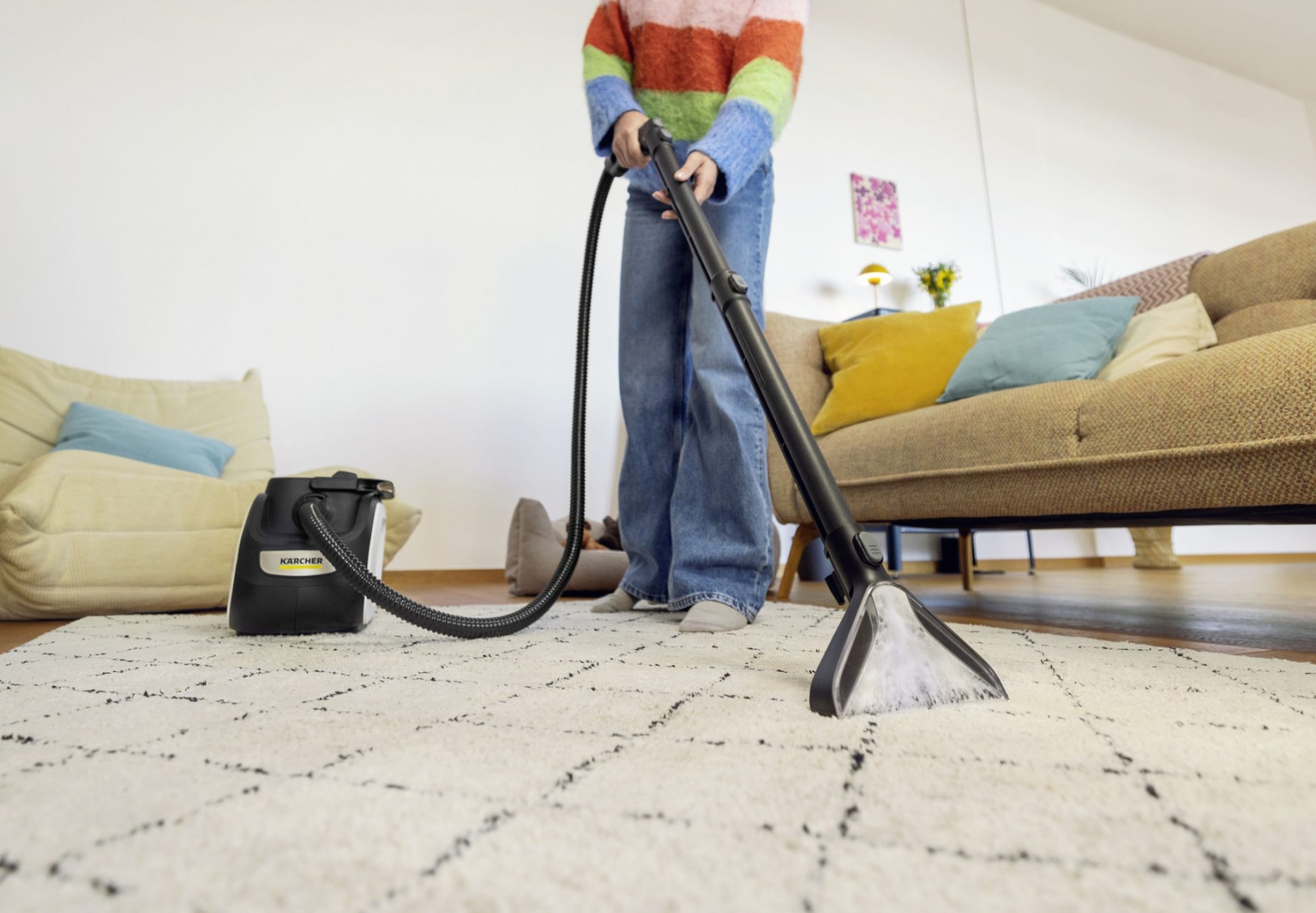 Der SE 3 Compact Home zeichnet sich durch seine kompakte Bauweise aus, die eine einfache Handhabung und platzsparende Aufbewahrung ermöglicht. Die Standardvariante enthält eine Waschdüse für Polster und eine schmale Fugendüse für enge Bereiche wie Sofaritzen. Ergänzend dazu bietet Kärcher den SE 3 Compact Home Floor speziell für die Teppichreinigung an. Mit zusätzlichem Zubehör wie der breiten 2-in-1 Waschdüse XXL und einem langen Sprühsaugrohr können Anwender Teppichflächen bequem im Stehen oder, wenn die Düse direkt am Handgriff angebracht wird, auch größere Polsterflächen in kurzer Zeit reinigen.