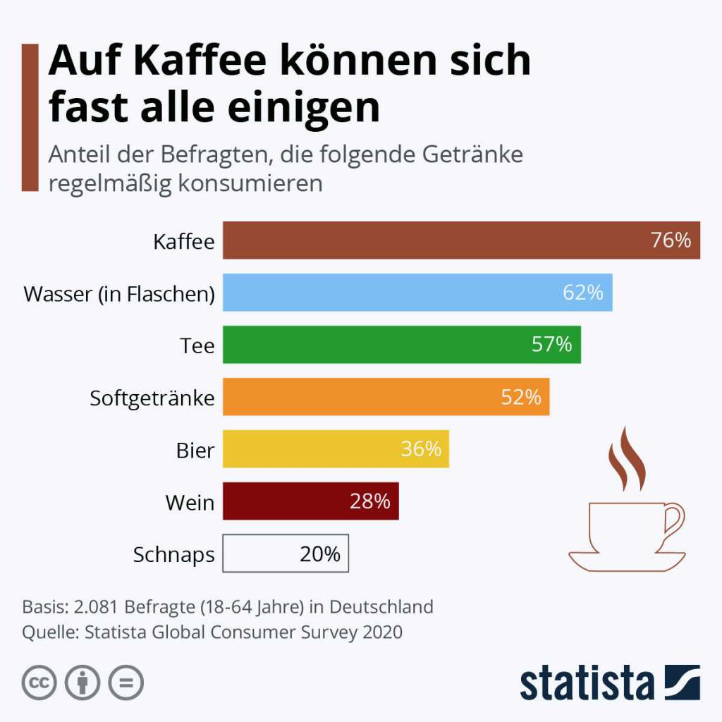 Laut „Statista Global Consumer Survey“ trinken 76% der befragten Menschen in Deutschland regelmäßig Kaffee. Damit wird das koffeinhaltige Getränk hierzulande von mehr Menschen getrunken als Wasser aus Flaschen oder Tee. Aber nicht nur auf die Frequenz kommt es an, sondern auch auf die Menge. Laut Deutschem Kaffeeverband trinkt jeder Bundesbürge rund 166 Liter Kaffee im Jahr, Tedenz leicht steigend.