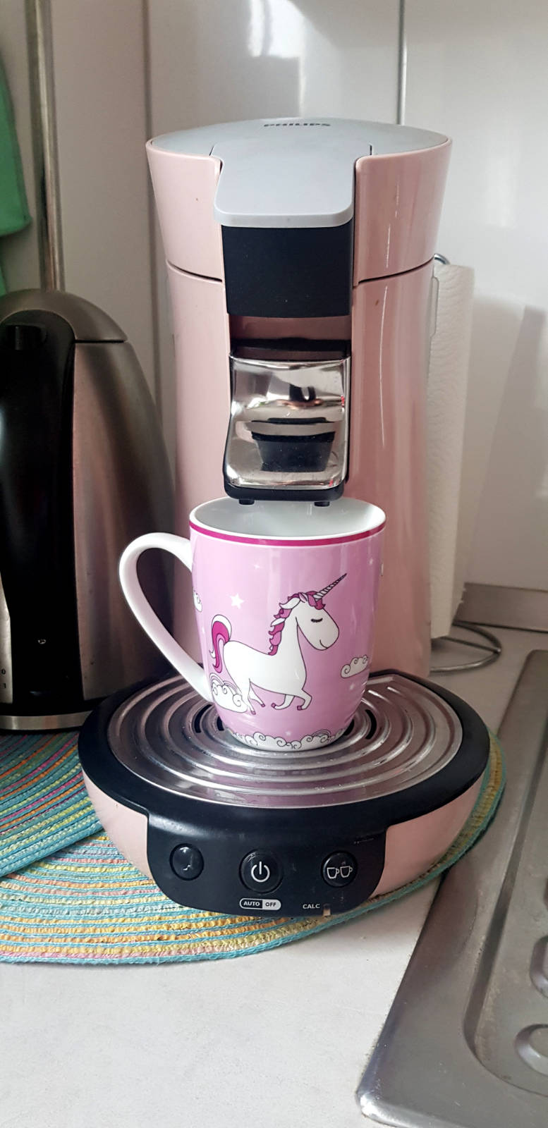 Vorher hatte ich eine kleine Kapselmaschine. Ich finde aber die Kapseln im Verhältnis zu den Pads extrem teuer. Als ich dann die rosafarbene Senseo Maschine gesehen habe, habe ich mich sofort verliebt und diese umgehend gekauft. Meine Pads kaufe ich immer in großer Menge in den Niederlanden. Das ist von Mönchengladbach fast ein Steinwurf, und der Preis dort ist unschlagbar. Und es stimmt: Entschieden habe ich mich für das konkrete Model tatsächlich wegen der Farbe. Na ja und weil es schnell geht.