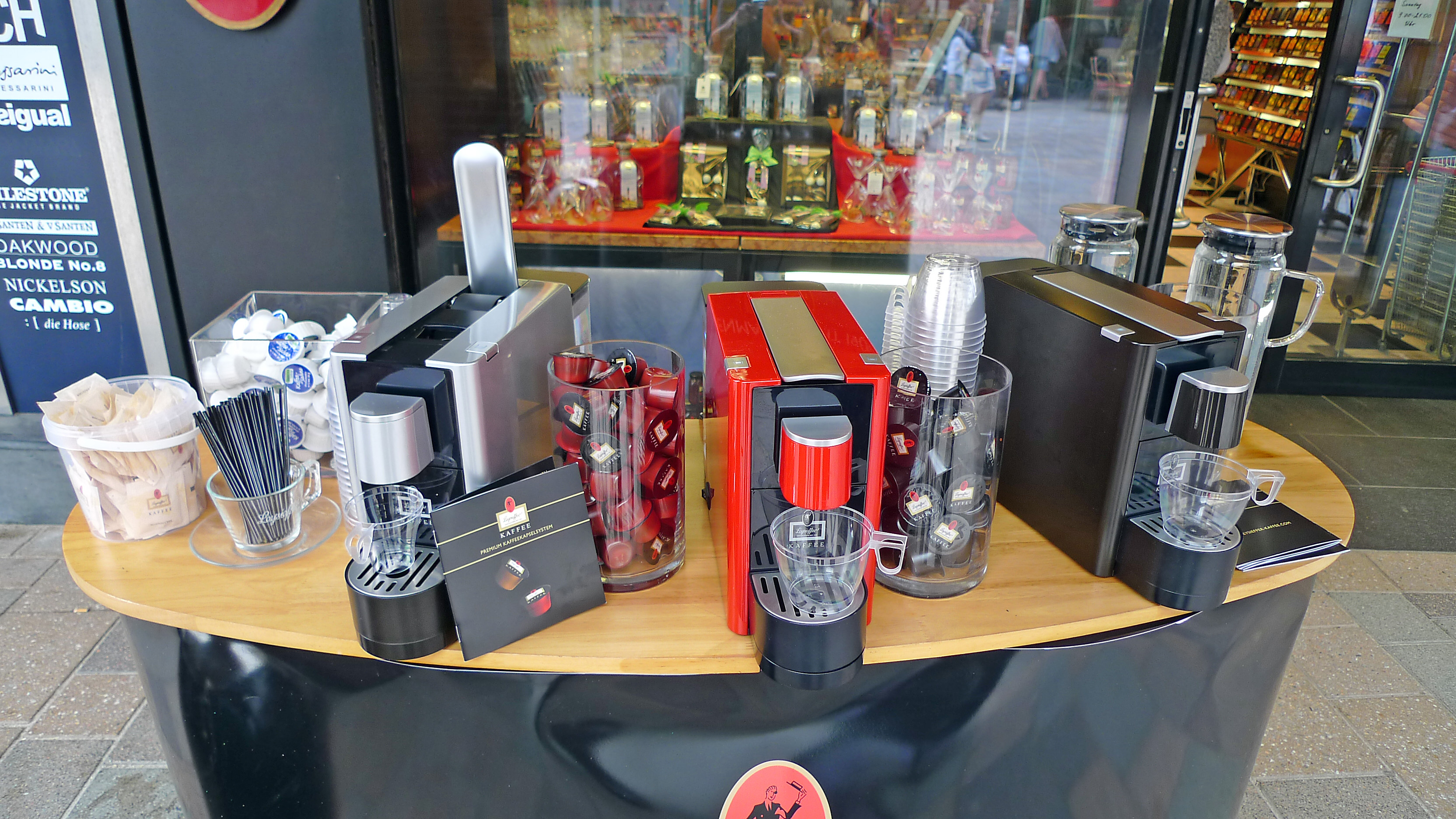 Und noch etwas zog mich an: Im Eingangsbereich von Leysieffer in der Friedrichstraße war eine große Promotiontheke aufgebaut, die meine (berufliche) Neugierde weckte. Ich traute meinen Augen nicht: Zu sehen war ein „Leysieffer Kaffee-Kapselsystem“, bestehend aus einer Maschine (149€ UVP) in den Farben schwarz, rot und silber. Dazu gibt es aktuell vier Kaffeevarietäten in den Sorten Espresso, Crema, Ristretto und Decaffeinato zu je 28 Cent. Nach Aussage der Promoterin ist das Kaffee-Kapselsystem nur über Leysieffer, über den eigenen Online Shop und über Lufthansa erhältlich.