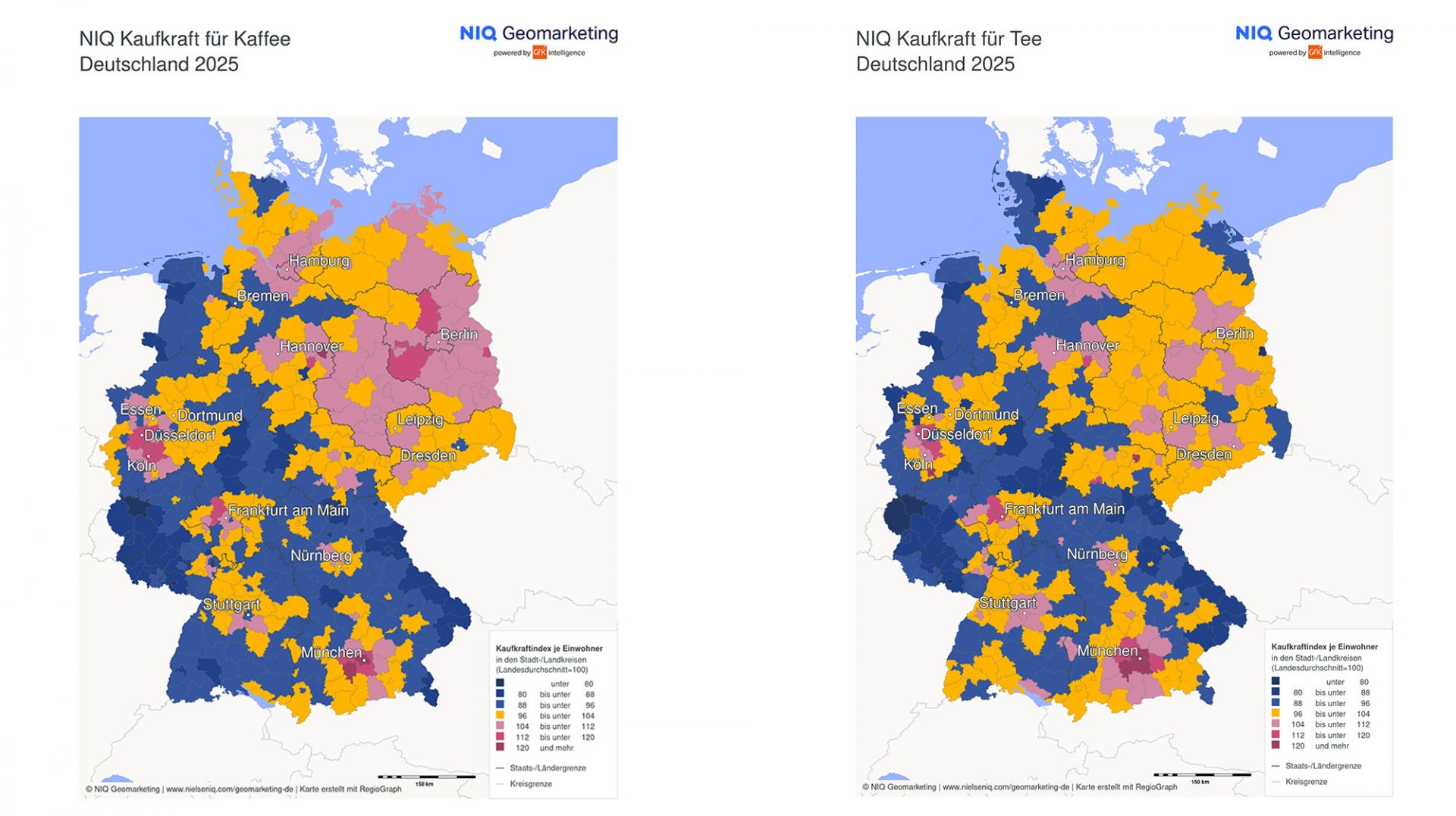 Eine aktuelle Untersuchung von NIQ Geomarketing auf Basis der Mikromarktdatenbank „microm Consumer Data“ zeigt deutliche regionale Unterschiede im Heißgetränkekonsum in Deutschland. Die Analyse ermittelt auf Ebene von Städten und Landkreisen, wo besonders häufig Kaffee oder Tee konsumiert wird. Grundlage der Auswertung sind mikrogeografische Daten mit Berücksichtigung von Merkmalen wie Haushaltsstruktur, Kaufkraft, Bildung und Konsumneigung.