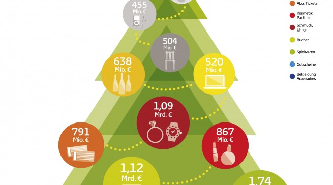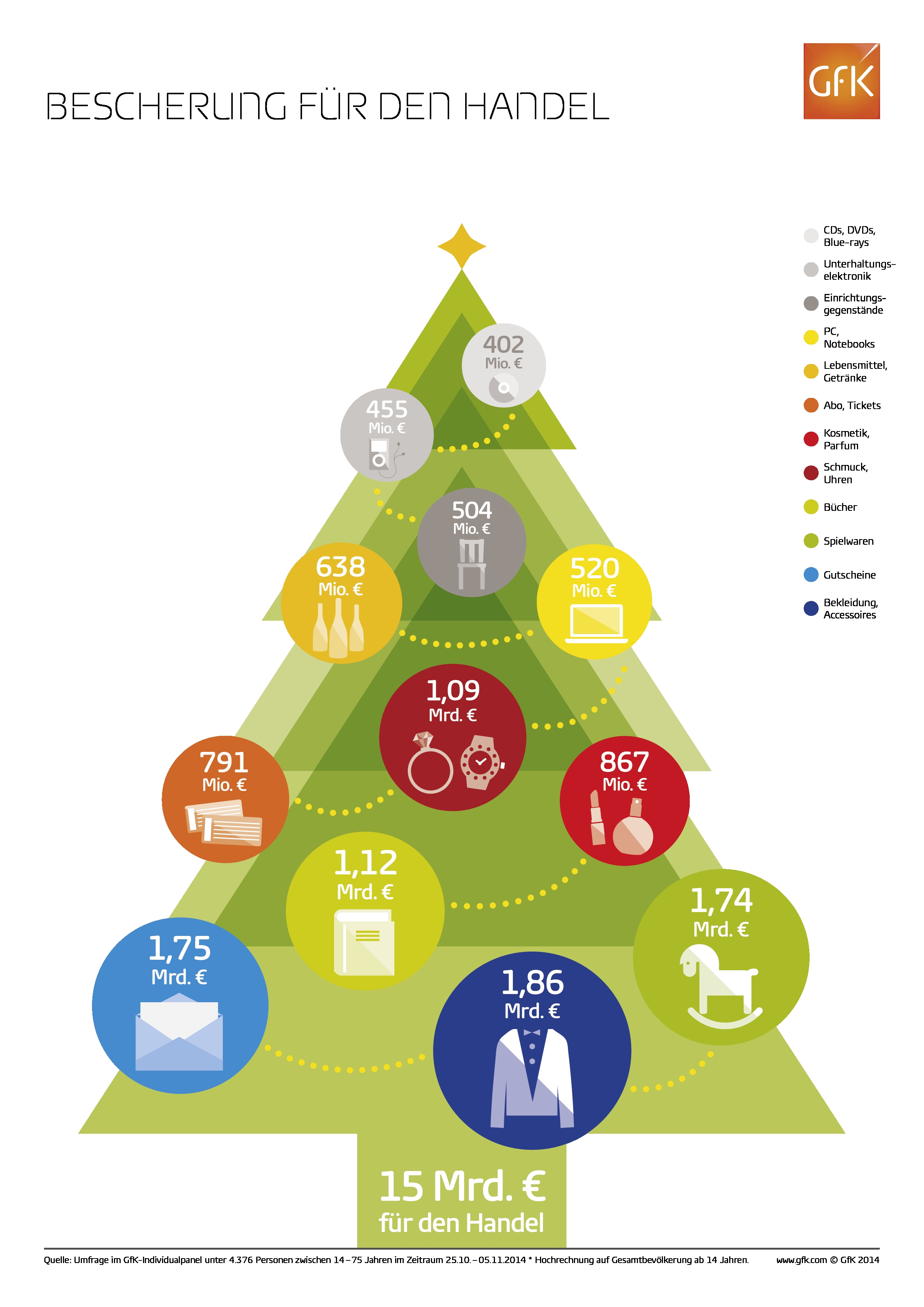 Der Handelsverband Deutschland prognostizierte am 11. November als einer der ersten für die letzten beiden Monaten des Jahres ein Umsatzplus von 1,2 % im Vergleich zum Vorjahr. Das entspricht einem Volumen von voraussichtlich 85,5 Milliarden Euro. Durchschnittlich 447 Euro, so der Verband, wollen die Verbraucher in diesem Jahr für Weihnachtsgeschenke ausgeben. Ein „konstantes Geschäft mit Weihnachtsgeschenken“ erwartet auch die Nürnberger GfK, die ihre Konjunkturdaten heute Mittag vorgestellt hat. Allerdings mit komplett anderen Zahlen.