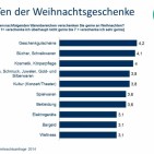 Zurück zur heutigen Pressekonferenz der GfK: Auch in diesem Jahr zeigen sich die Deutschen zu Weihnachten in Summe ziemlich großzügig. Mit 285 Euro sind die geplanten Ausgaben zwar 3 Euro geringer als in 2013. Das Niveau ist aber unverändert hoch. „Um bei der Wahl des Geschenks nicht daneben zu greifen, verschenken die Deutschen auch gerne wieder Bargeld. Das dürfte vor allem in den Tagen nach dem Fest zu einem Großteil in die Kassen der Händler fließen, Umtausch-Welle inklusive. Insgesamt werden die Bargeschenke ein Volumen von 3,4 Milliarden Euro umfassen“, so Gfk-Handelsexperte Dr. Wolfgang Adlwarth.