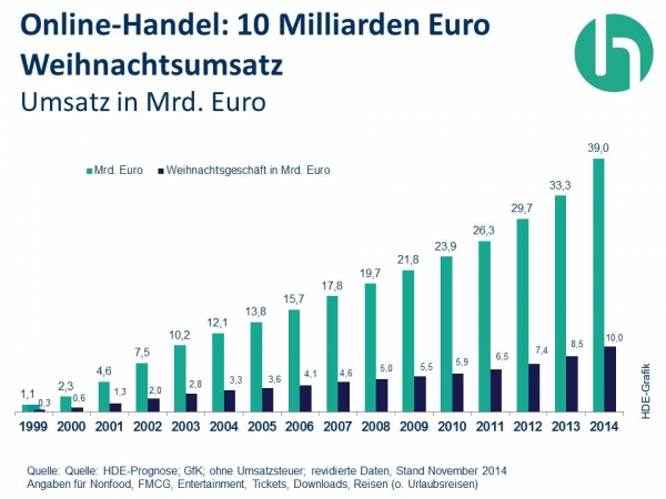Im Gegenteil: Die Online-Umsätze werden im November und Dezember 2014 bei 10 Mrd Euro liegen, sagt Handelsverbandspräsident Josef Sanktjohanser. Das ist gegenüber dem Vorjahr ein Anstieg um 18 %. Das Gesamtvolumen im deutschen Online-Handel wird 2014 nach HDE-Prognose bei 39 Mrd Euro liegen. So wird im Non-Food-Bereich bereits jeder fünfte Euro über das Internet umgesetzt.