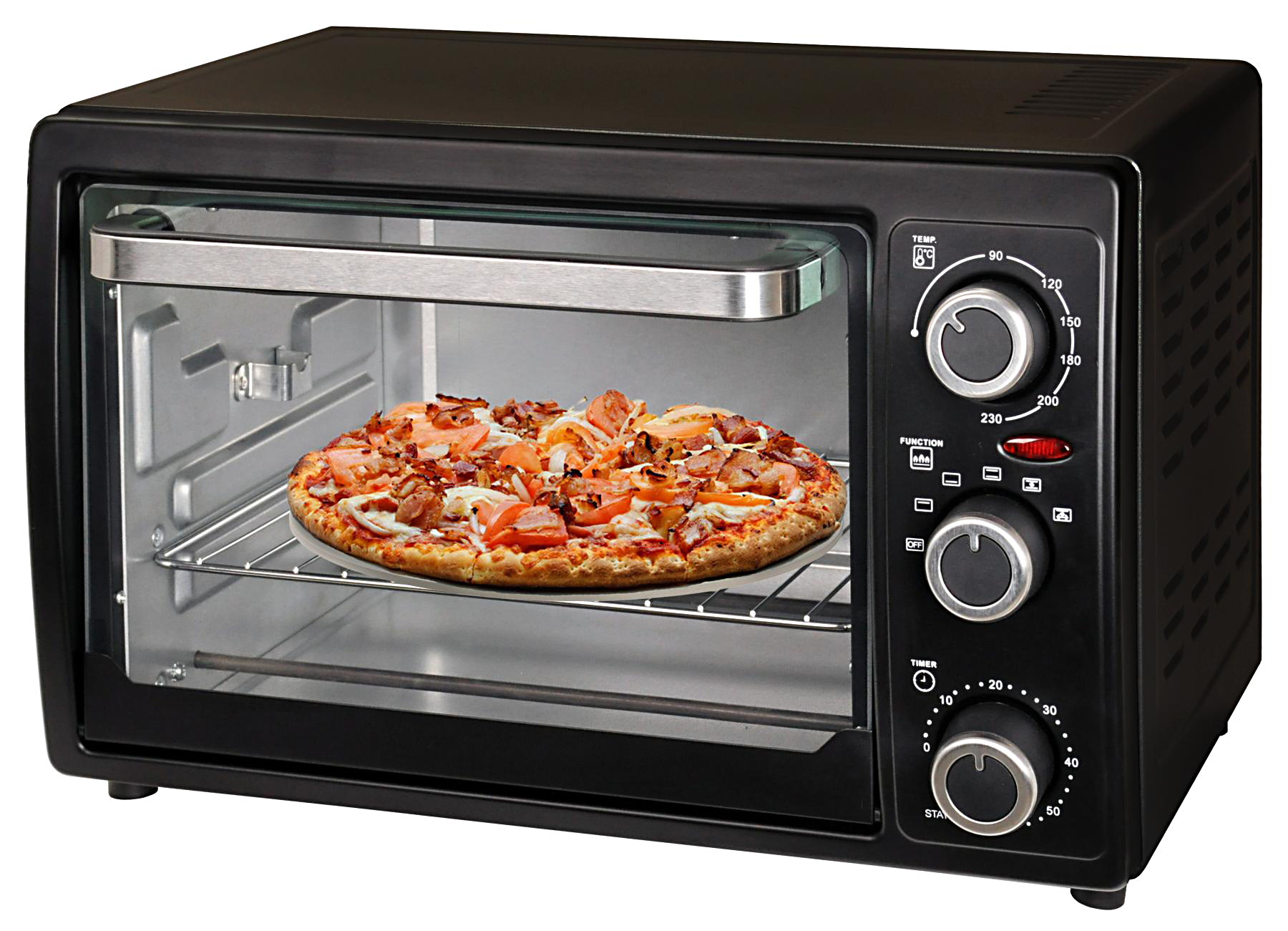 Zur Ausstattung gehören beim Kalorik Backofen TKG OT 1030 CRP ein. Drehspieß, ein Pizzastein, ein Backblech sowie ein verchromter Grillrost und eine Herausnehmhilfe. Außerdem sind im Lieferumfang Einschubschienen für Backblech und Grillrost. Der 60 Minuten Timer hat eine automatische Abschaltung. Für einen stabilen Stand sorgen 4 rutschfeste Füße.