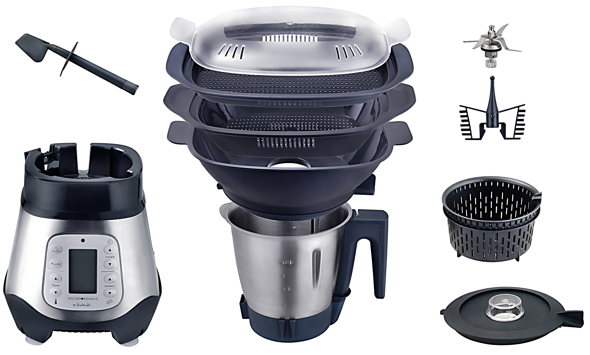 Die Kalorik Küchenmaschine TKG HA 1003 KTO eignet sich zum Kochen, Mixen, Rühren, Kneten, Dämpfen, Frittieren, Sahne schlagen und vielem mehr. Der abnehmbare Edelstahlbehälter hat ein Fassungsvermögen von 2 Liter. Die 1000 Watt Heizleistung sorgen für eine schnelle Erwärmung und für eine gleichmäßige Temperaturverteilung, regelbar zwischen 37-130°C. Der 500-Watt-Motor verfügt über 10 voreingestellte Leistungsstufen: 1-3 zum Kneten von Teig, 4-9 zum Mixen und Zerkleinern und 10 Turbo-Stufe.