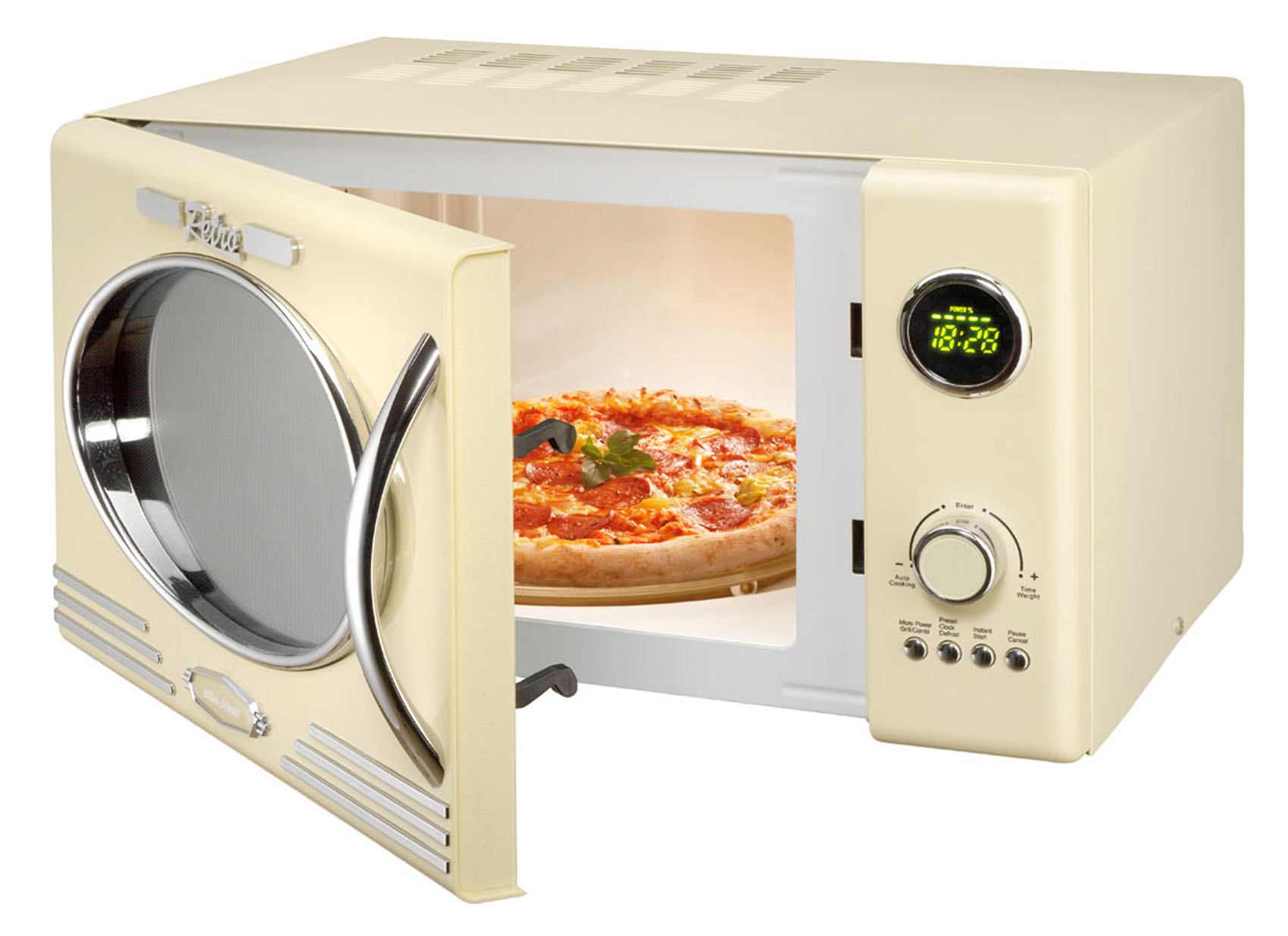 Die Kalorik Mikrowelle SC MW 2500 DG hat einen 25 Liter großen Innenraumvolumen. Die Leistung der Mikrowelle beträgt 900 Watt, als Grill 1.000 Watt. 5 Mikrowellen-Leistungsstufen und 12 automatische Garprogramme ermöglichen den vielseitigen Einsatz des Gerätes.