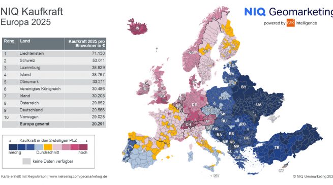 Die NIQ Kaufkraft Europa 2025 basiert auf nominalen Pro-Kopf-Einkommen nach Abzug von Steuern und Sozialabgaben, inklusive staatlicher Transferleistungen. Die Daten werden für 42 europäische Länder bis auf Gemeinde- und Postleitzahlebene bereitgestellt. Grundlage der Berechnung sind unter anderem Einkommensteuerstatistiken, Sozialdaten sowie makroökonomische Prognosen. Die Ergebnisse sind nicht inflationsbereinigt.