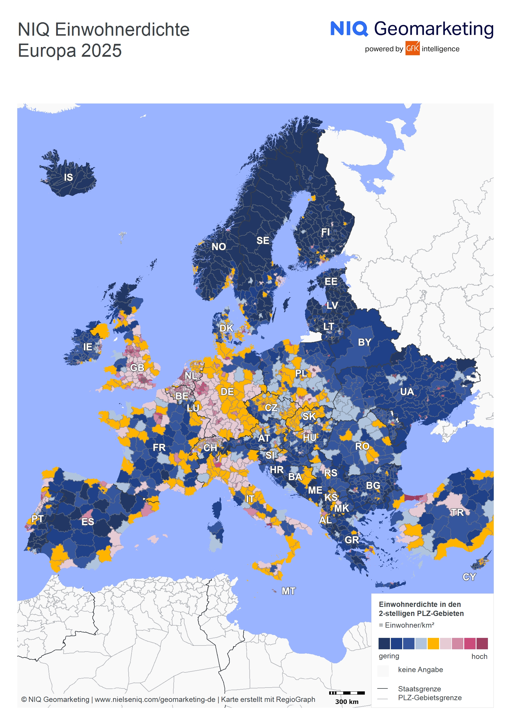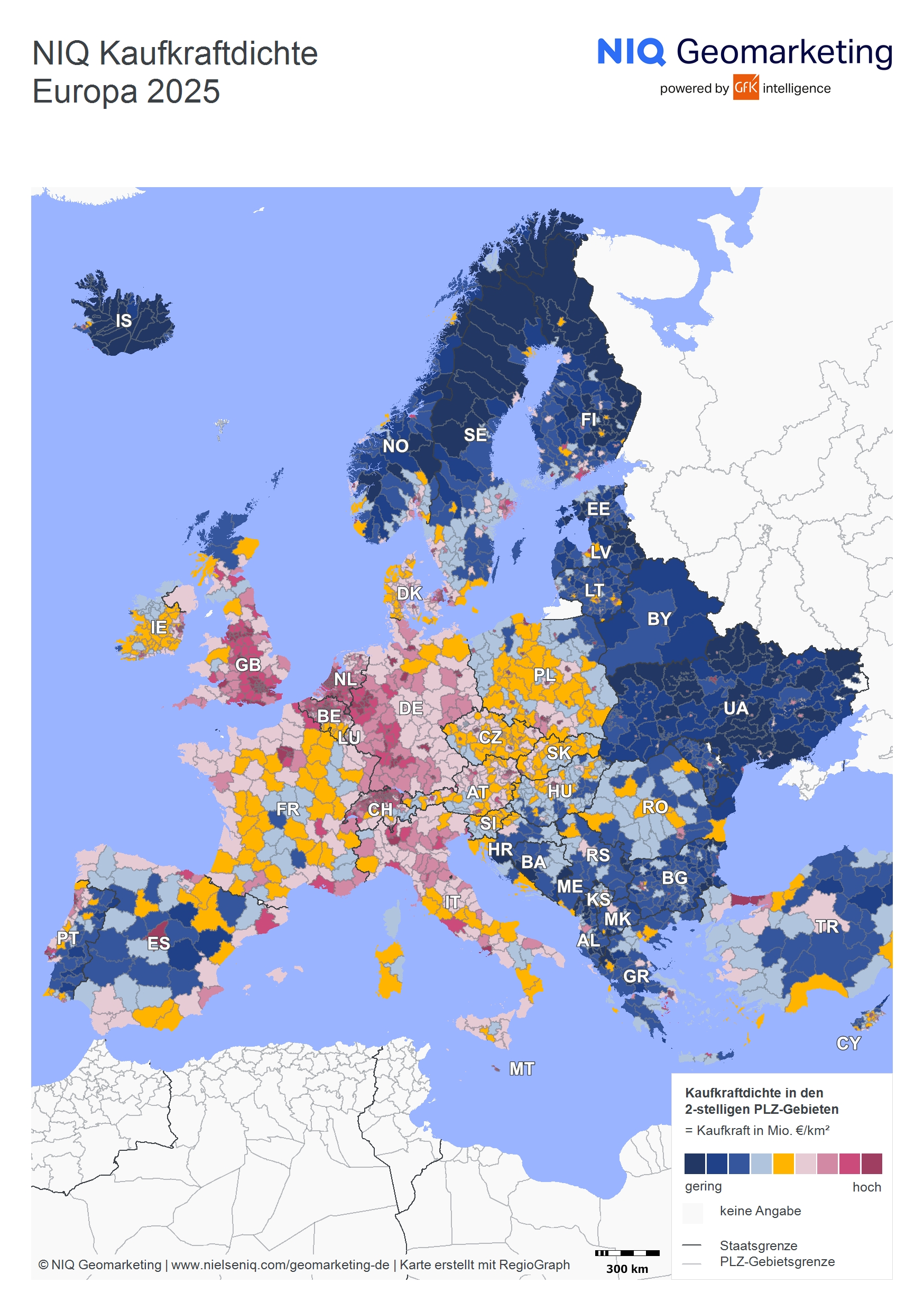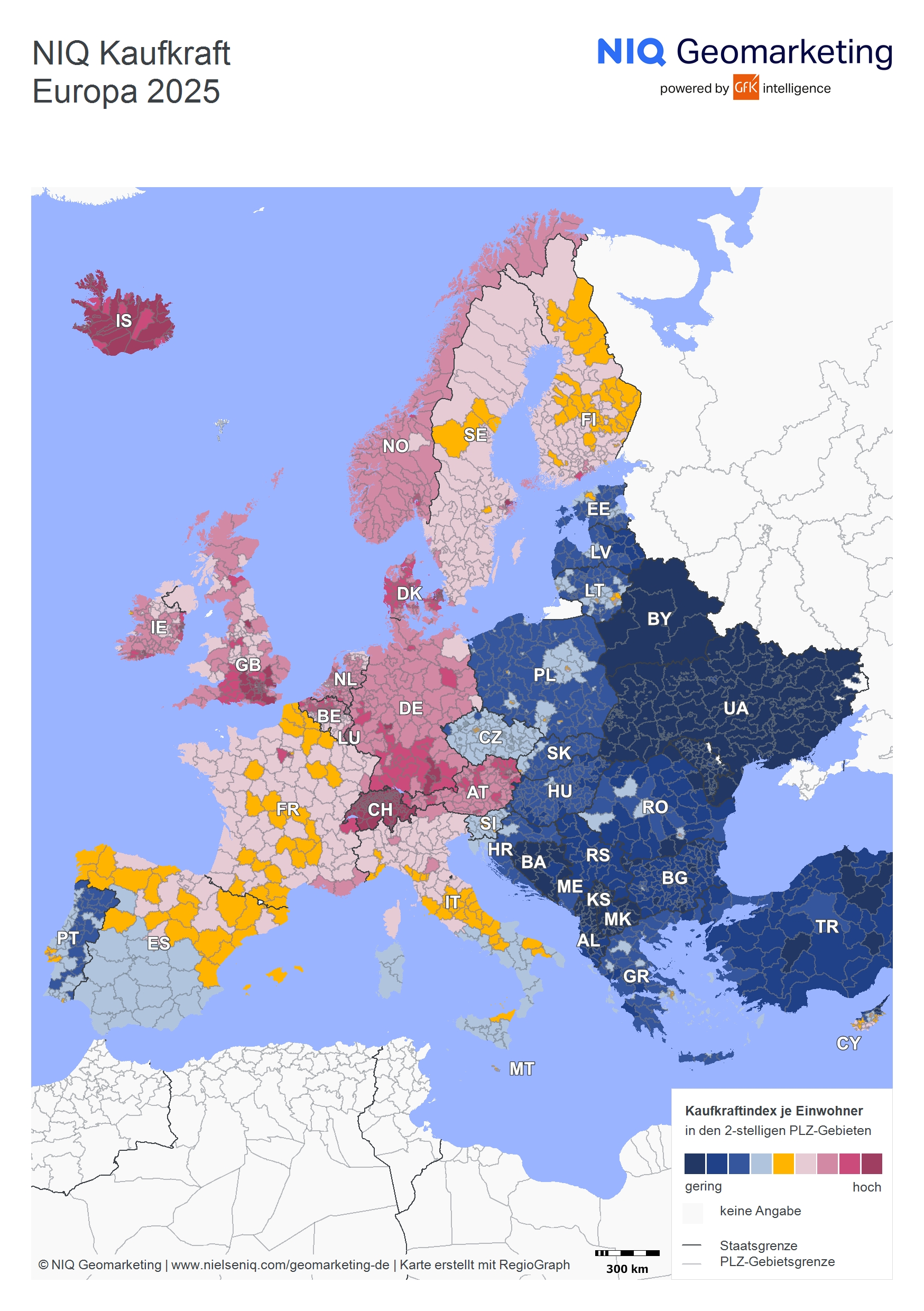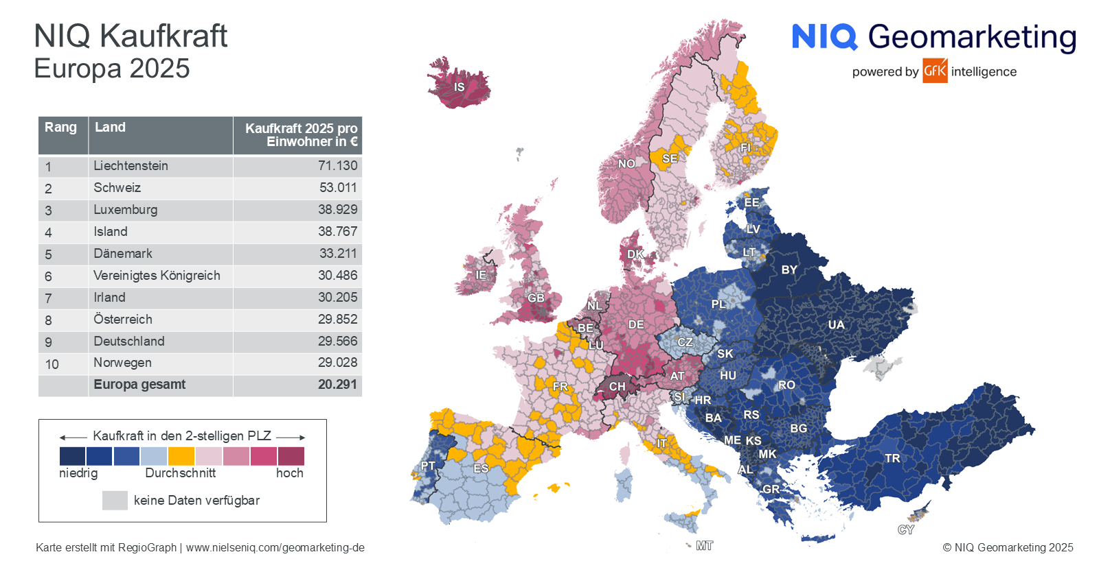 Die NIQ Kaufkraft Europa 2025 basiert auf nominalen Pro-Kopf-Einkommen nach Abzug von Steuern und Sozialabgaben, inklusive staatlicher Transferleistungen. Die Daten werden für 42 europäische Länder bis auf Gemeinde- und Postleitzahlebene bereitgestellt. Grundlage der Berechnung sind unter anderem Einkommensteuerstatistiken, Sozialdaten sowie makroökonomische Prognosen. Die Ergebnisse sind nicht inflationsbereinigt.