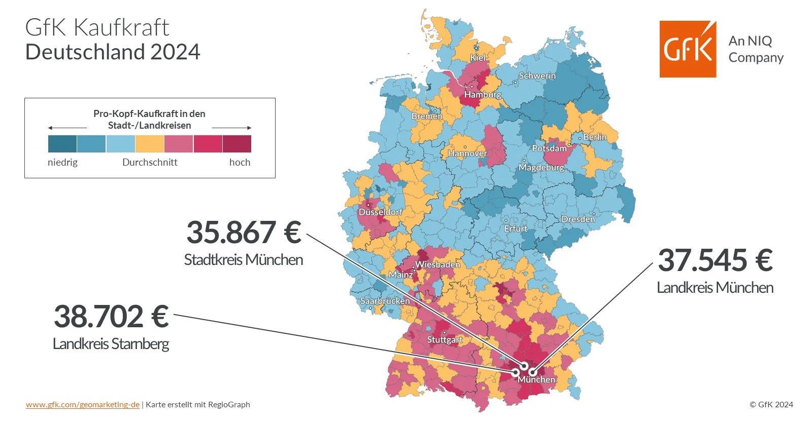 Spitzenreiter unter allen 400 Stadt- und Landkreisen ist der Landkreis Starnberg, wo die Menschen ein Ausgabepotenzial von 38.702 EUR haben. Damit liegen die Starnberger 39% über dem Bundesdurchschnitt. Auf den Plätzen zwei und drei folgen der Land- und Stadtkreis München mit 37.545 EUR und 35.867 EUR. Schlusslicht ist wie in den Vorjahren der Stadtkreis Gelsenkirchen: Dort verfügen die Bewohner über ein Nettoeinkommen von 22.007 EUR, womit sie 21% weniger für ihre Ausgaben und zum Sparen zur Verfügung haben als der Durchschnittsdeutsche.
