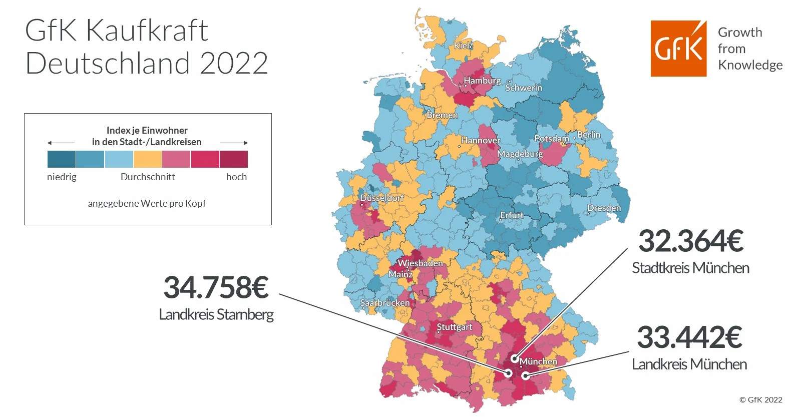 Mit einer Pro-Kopf-Kaufkraft von 34.758 EUR stehen den Starnbergern 40% mehr als dem Bundesdurchschnitt für ihre Ausgaben und zum Sparen zur Verfügung. Auf dem zweiten Rang folgt der Landkreis München (33.442 EUR), während sich der Stadtkreis München (32.364 EUR) in diesem Jahr auf Platz drei vorschiebt.