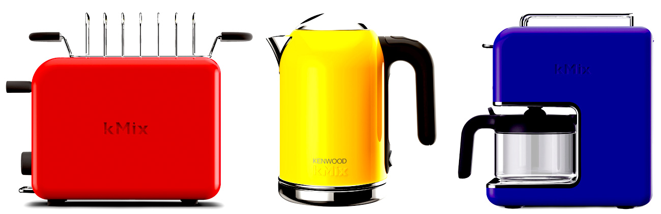 Jedes Gerät der Frühstücks-Serie ist in sechs unterschiedlichen pop-pigen Gouache-Farben erhältlich. Alle lassen sich kunterbunt mitein-ander kombinieren, wie auf der Leinwand eines Pop Art-Malers: Eine Kaffeemaschine in Zinkgrau passt ohne weiteres zu einem Toaster in Mohnrot, der Wasserkocher in Royalblau gesellt sich problemlos zu diesem Duo. Die weiteren Farben Grasgrün, Sonnengelb und Mars-schwarz. Verbindendes Element: ist das typisch britische Kenwood-Design.