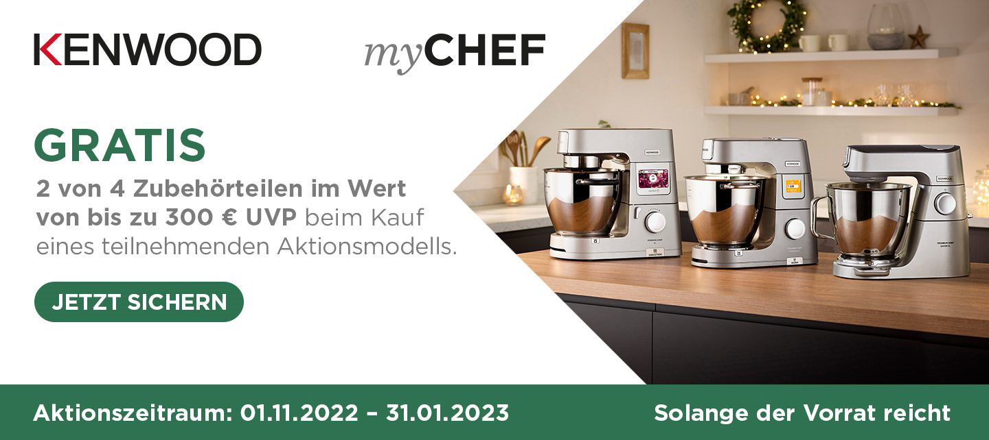 Kunden, die im Aktionszeitraum vom 1. November 2022 bis 31. Januar 2023 ein Modell der Serien Cooking Chef XL, Titanium Chef Patissier XL, Titanium Chef Baker oder Titanium Chef Baker XL kaufen, erhalten zwei Zubehörteile im Gesamtwert von 300 Euro kostenlos dazu.