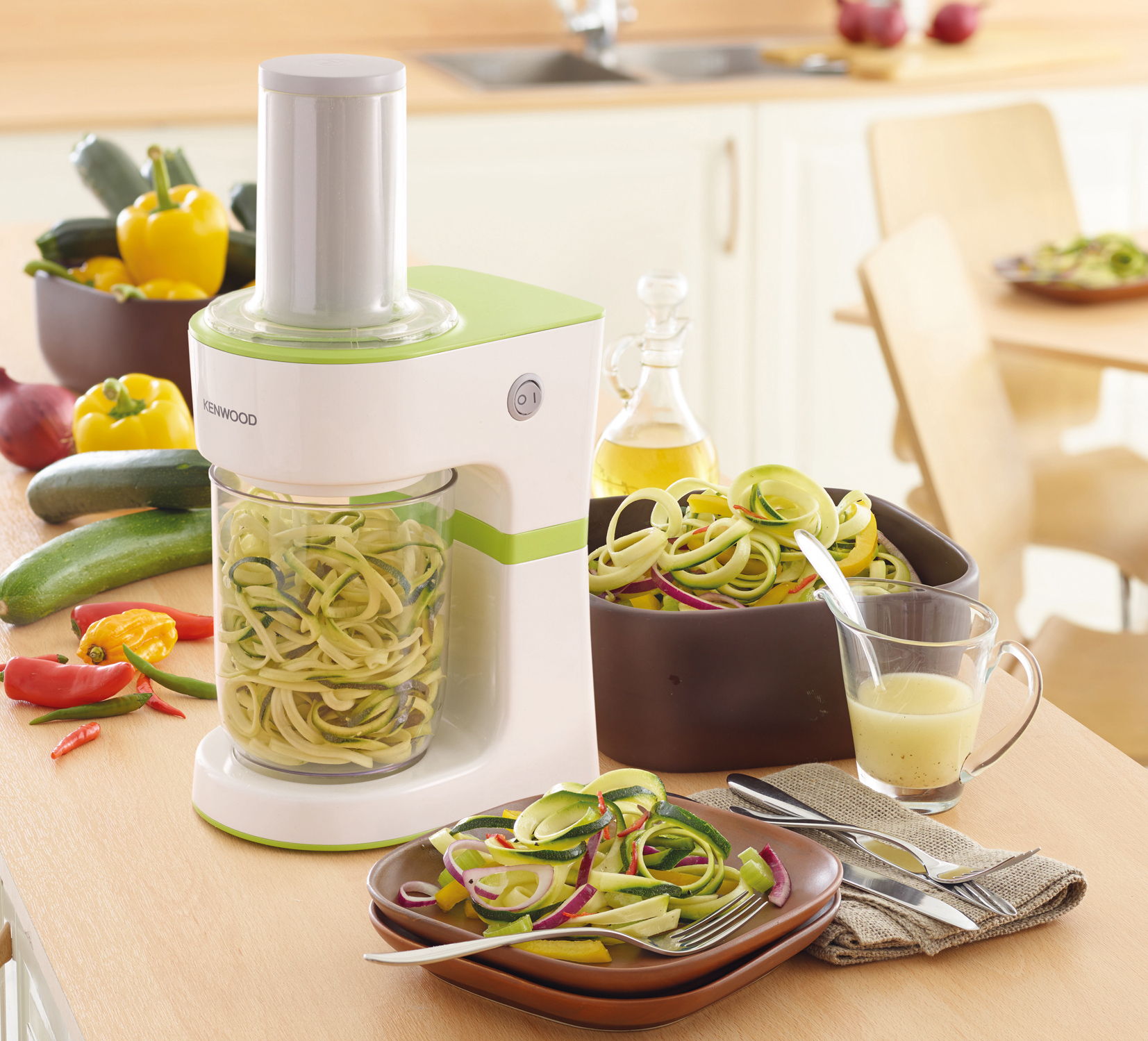 Der Kenwood Spiralschneider FGP203WG sorgt für Formenvielfalt in deutschen Küchen. Ohne anstrengendes Raspeln oder manuelles Kurbeln produziert das 70 Watt starke Gerät Obst und Gemüse im Pastastyle.