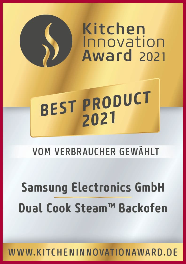 Samsung kann sich beim Kitchen Innovation Award 2021 drei Mal freuen: Der Dual Cook Steam Backofen hat die goldene Auszeichnung „Best of the Best: Elektrogroßgeräte“, „Ausgezeichnetes Produkt“ und „Produkt 2021“ in der Abstimmung von rund 1.500 Verbrauchern und der Experten-Jury erhalten.