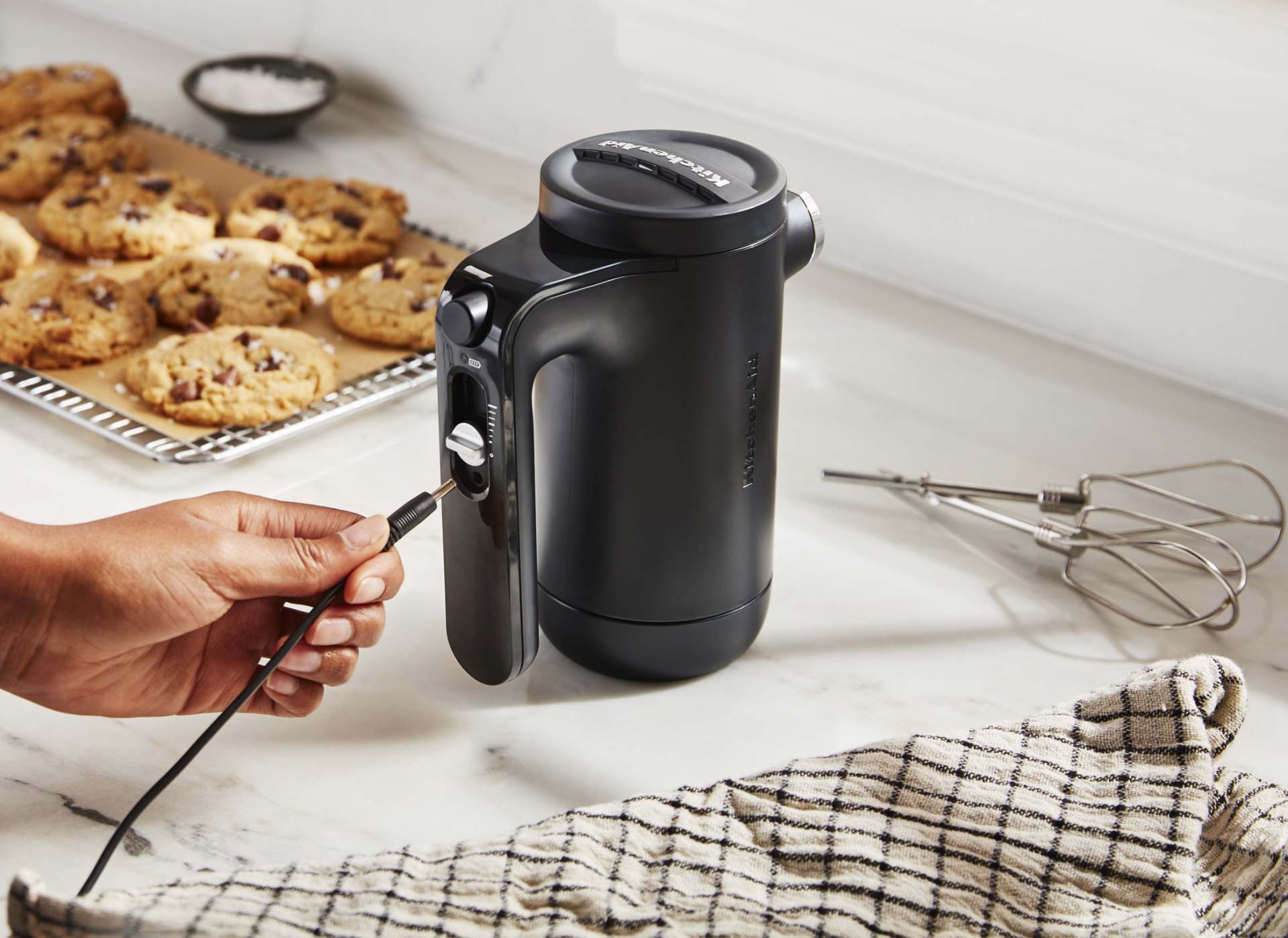 Der KitchenAid Handrührer Cordless arbeitet ohne Kabel, mit einem Li-Ion-Akku, der innerhalb von zwei Stunden voll aufgeladen ist. Auch nach einer Teilentladung ist das Geräte einsatzfähig. Eine Batterieanzeige zeigt die Ladekapazität an. Die Cordless-Serie besteht aus Handrührer, Stabmixer und Zerkleinerer.