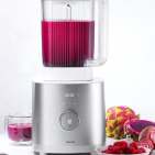 Das S-förmige Messer aus Edelstahl ist zur Sicherheit mit einem Messerschutz versehen. Zur weiteren Ausstattung gehören ein 710 ml-Mixerkrug (BPA-frei), einschließlich Skala sowie ein Spritzschutzdeckel und Ausgießer.