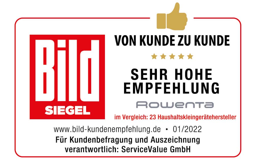 In der Studie „Kundenempfehlung“ überzeugt Rowenta erneut die Verbraucher und erhält zum zweiten Mal in Folge die Auszeichnung „Sehr hohe Empfehlung“ in der Kategorie Haushaltskleingerätehersteller.