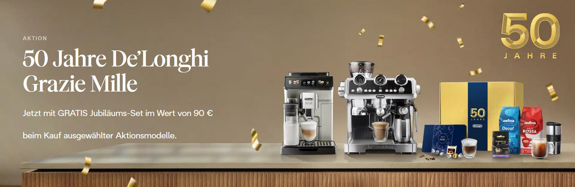 Im Jubiläumsjahr von De’Longhi erhalten Kunden beim Kauf ausgewählter Premiumprodukte bis zum 31. Dezember 2024 ein De’Longhi Jubiläums-Set im Wert von 90 EUR gratis dazu: Dies gilt neben der La Specialista Maestro und der Eletta Explore unter anderem auch für die Produkte Opera, Rivelia, PrimaDonna Soul sowie Maestosa und Dinamica. Das exklusive Set beinhaltet hochwertige Geschenke wie jeweils zwei De’Longhi Cappuccino Gläser und De’Longhi Tassen, einen Thermobecher, Lindt Schokolade sowie verschiedene Lavazza Kaffeebohnen. Mehr Informationen zu der Jubiläums-Aktion gibt es hier.