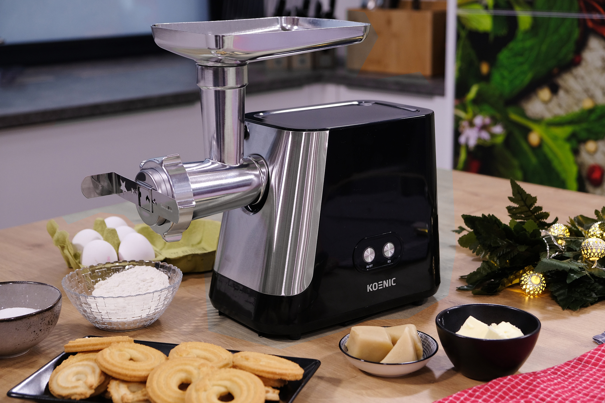 Der Koenic Fleischwolf KMG 4151 B verfügt über einen Wurstfüll- und einen Spritzgebäckvorsatz sowie drei unterschiedlich großen Lochscheiben.