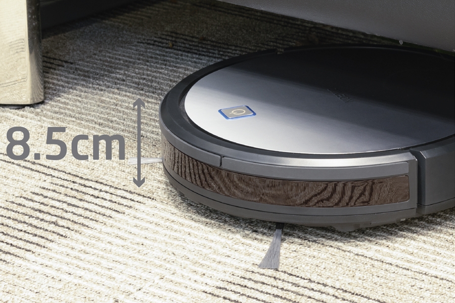 Der Staubsauger reinigt sowohl Hartböden wie Parkett, Laminat und Fliesen als auch Teppiche, Vorleger und Läufer. Auf seinen gummierten Rädern rollt er leise und sicher über jeden Untergrund. Das Gerät misst nur 85 mm in der Höhe und 320 mm im Durchmesser. Fünf Anti-Stoßsensoren sorgen dafür, dass der Roboter nirgends aneckt. Der HEPA 10-Filter garantiert, dass der im Staub enthaltene Feinstaub zu 85 % gefiltert und beim Staubsaugen nicht wieder an die Umgebungsluft abgegeben wird. Nach 1,5 Stunden Betriebszeit fährt der Sauger in die Ladestation fährt, um seinen Akku wieder aufzuladen. Ist der 350 ml fassende Staubbehälter schon vorher voll, stellt er seine Arbeit ein, um Energie zu sparen.