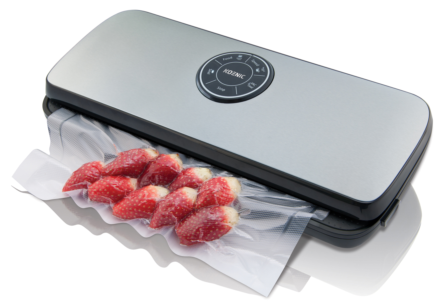 Der Koenic Vakuumierer KVS 3411M ist ein kompakter Vakuumierer, der mit 110 Watt und 0,8 bar entlüftet. Damit die Erdbeeren beim Vakuumieren nicht zerquetscht, die Steaks aber fest umschlossen werden, lässt sich der Härtegrad der Lebensmittel individuell einstellen.