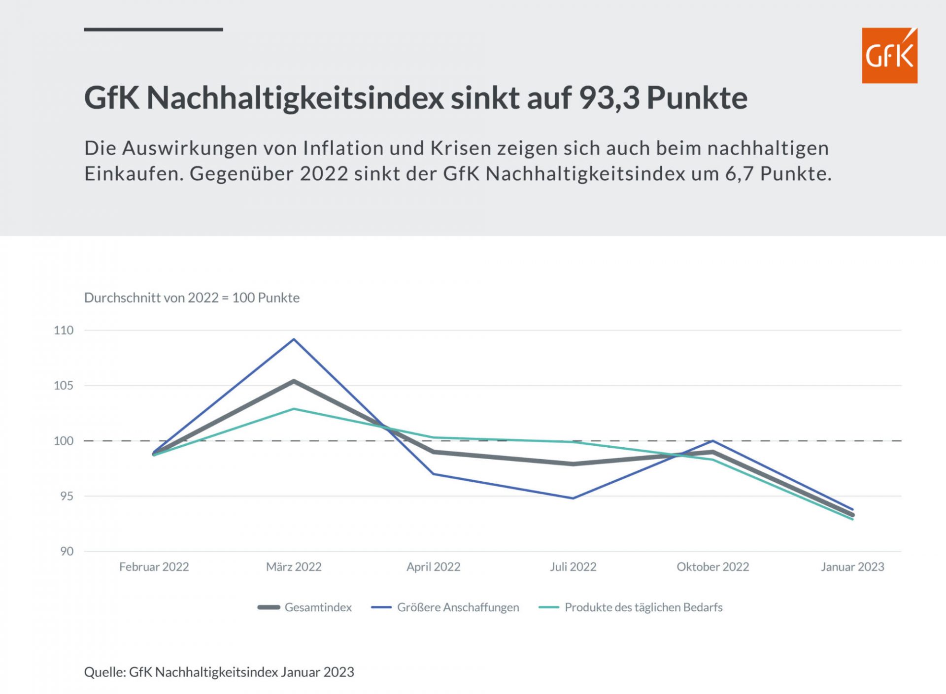 Globale Krisen und gesellschaftspolitische Herausforderungen sorgen weiterhin für Konsumzurückhaltung in der deutschen Bevölkerung. Besonders im Bereich Fast Moving Consumer Goods (FMCG) verzeichnet die Gesellschaft für Konsumforschung (GfK) einen Rückgang um 7,1 Punkte auf 92,9 Punkte. Der Index für nachhaltige größere Anschaffungen verliert etwas moderater und liegt bei 93,8 Punkten (Rückgang um 6,2 Punkte gegenüber 2022).